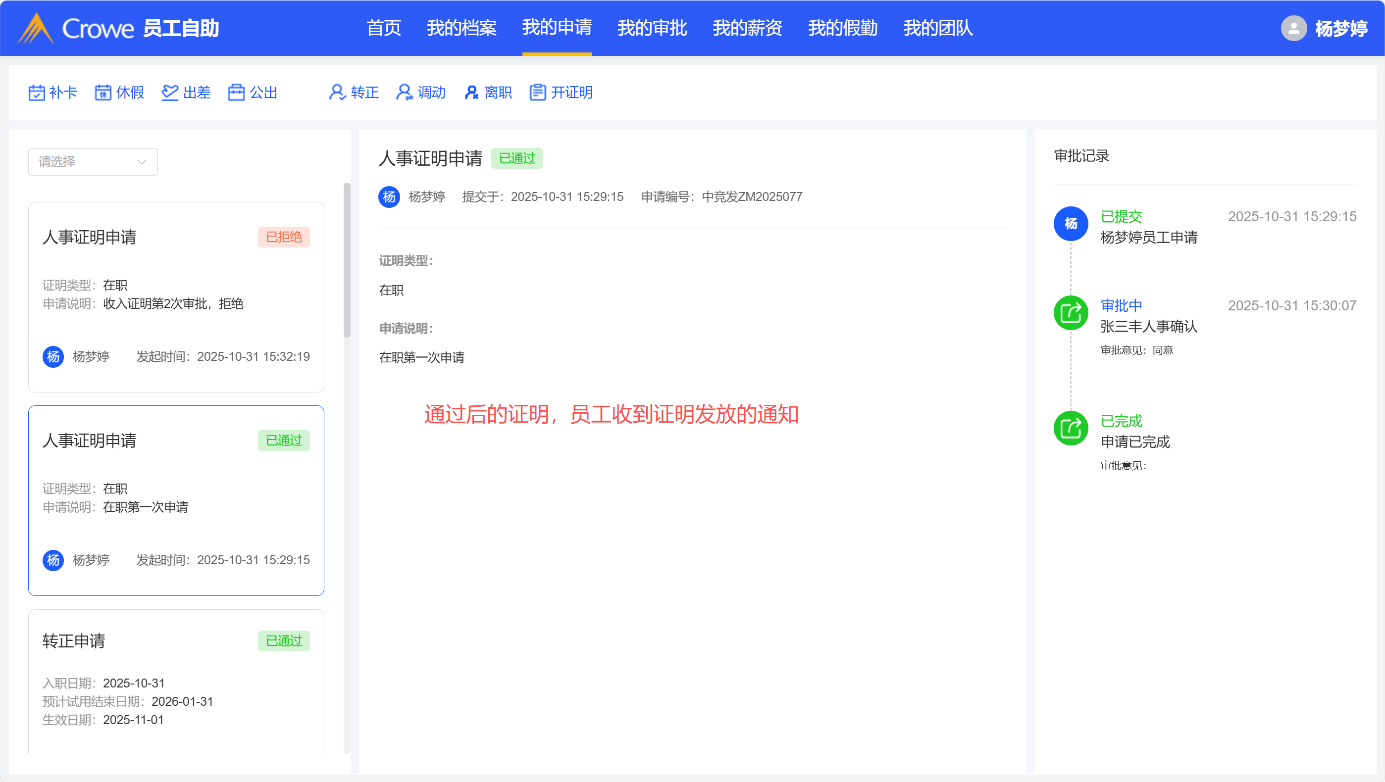 人事证明审批同意后首页未收到通知