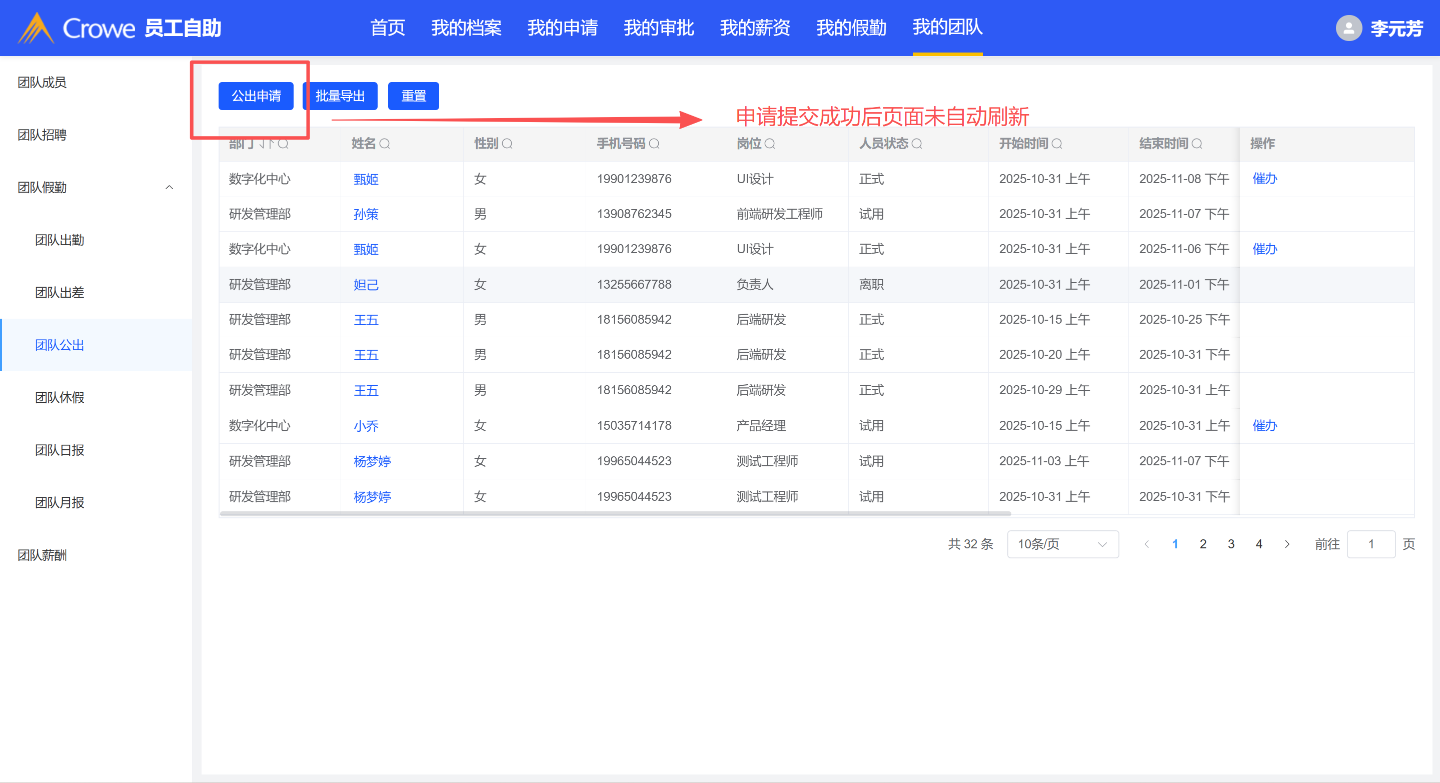 申请提交成功后页面未自动刷新