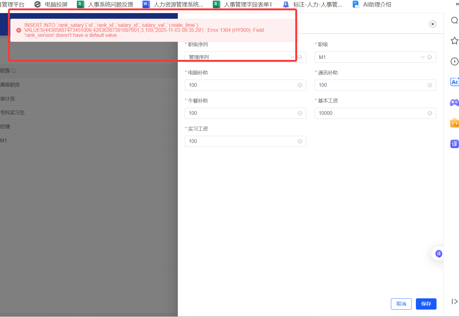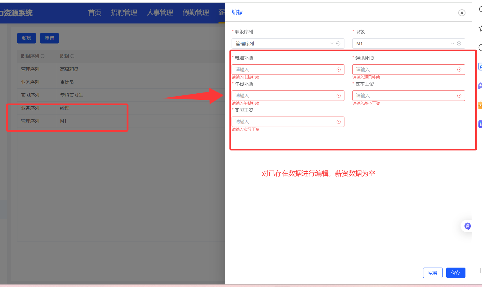 薪酬设置--职级序列 编辑已存在的职级数据,编辑页面数据为空,重新编辑数据后保存,报错