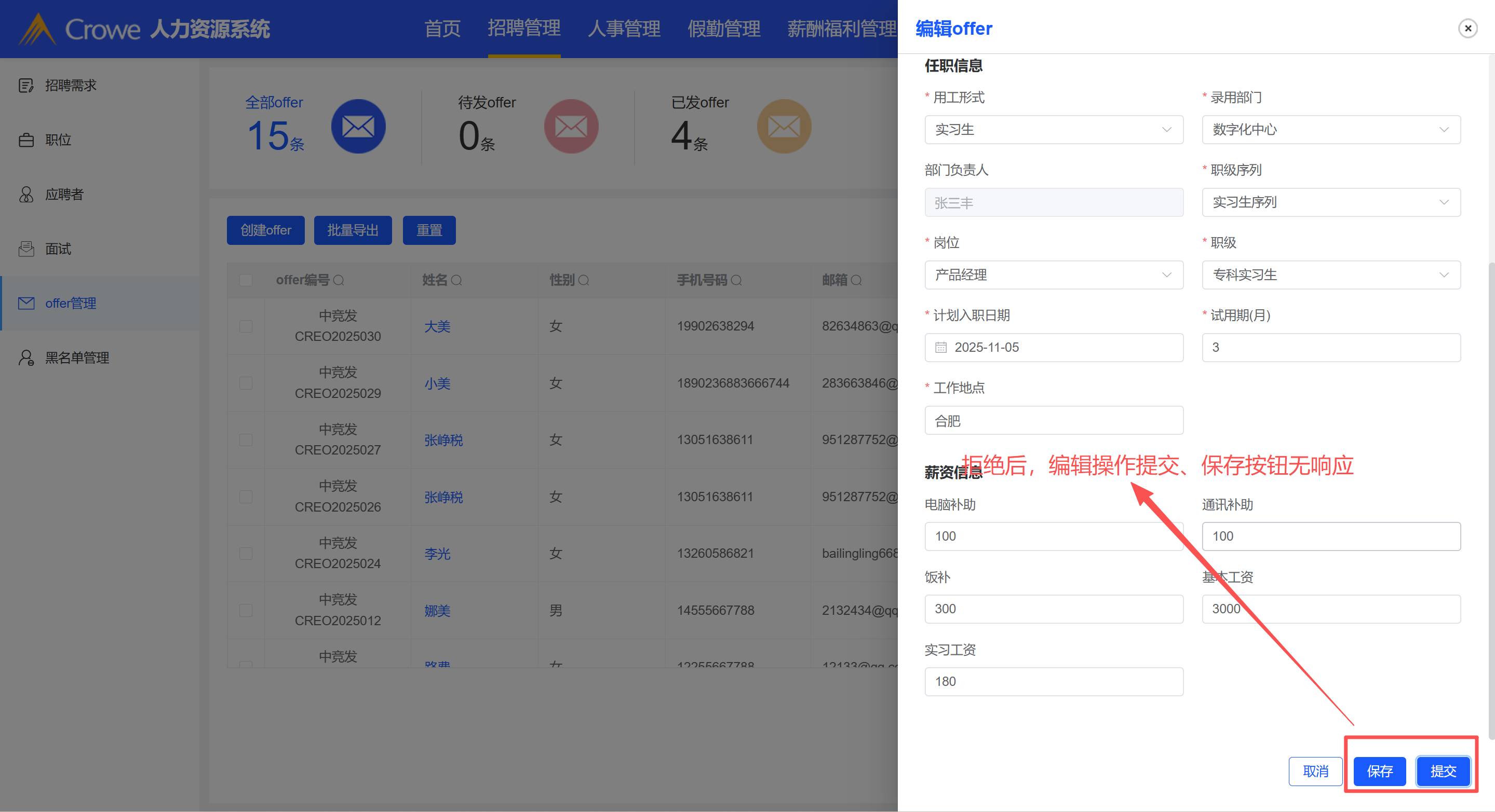 offer被拒绝后,点击编辑按钮,修改内容后提交无响应
