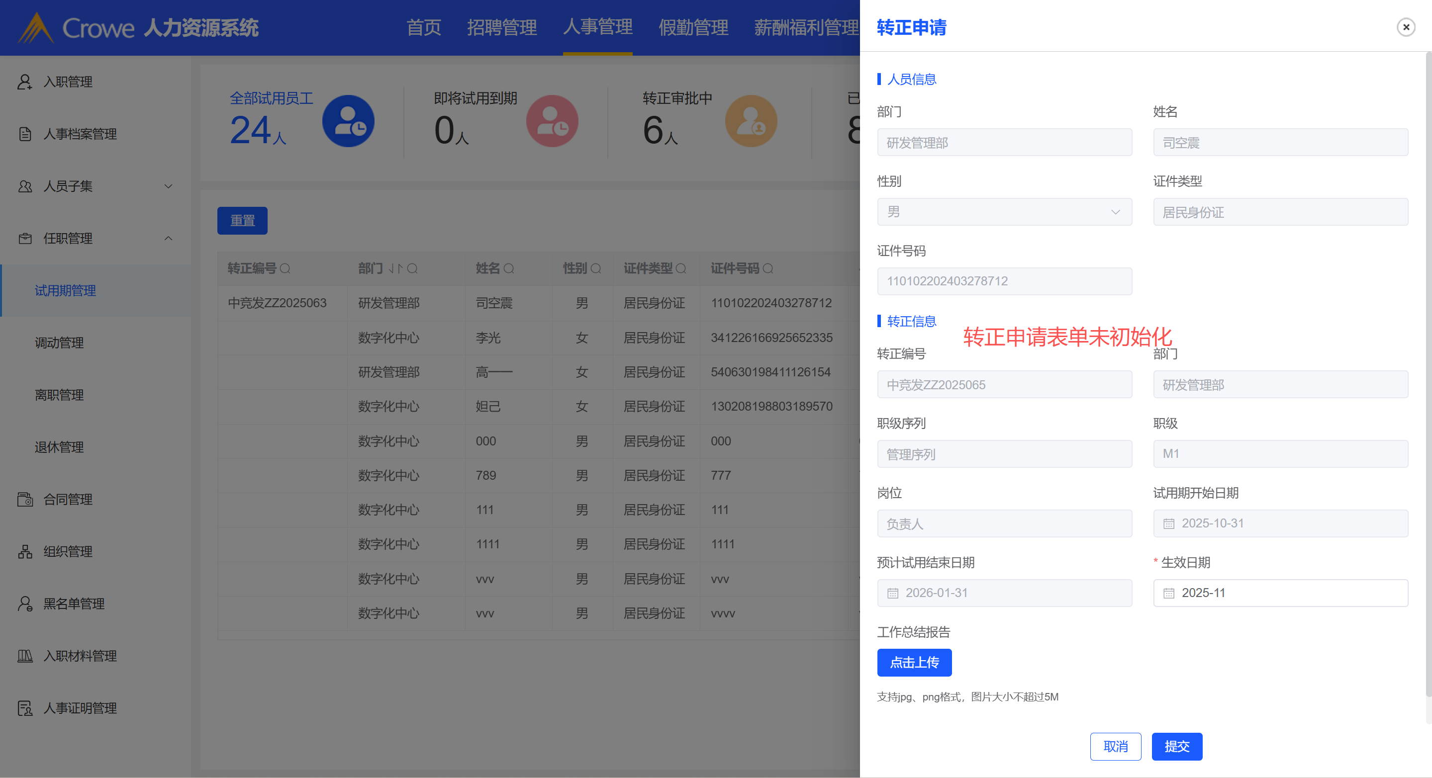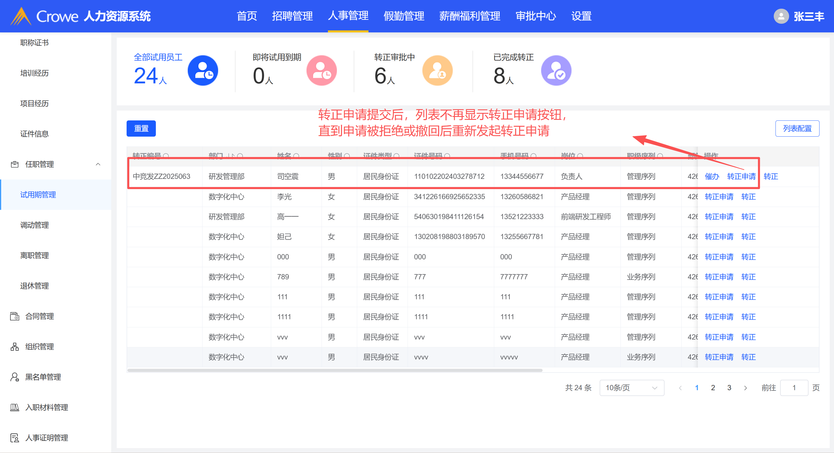 发起转正申请后列表对应的操作小时,需在被拒绝或者撤回申请后才能重新发起转正申请