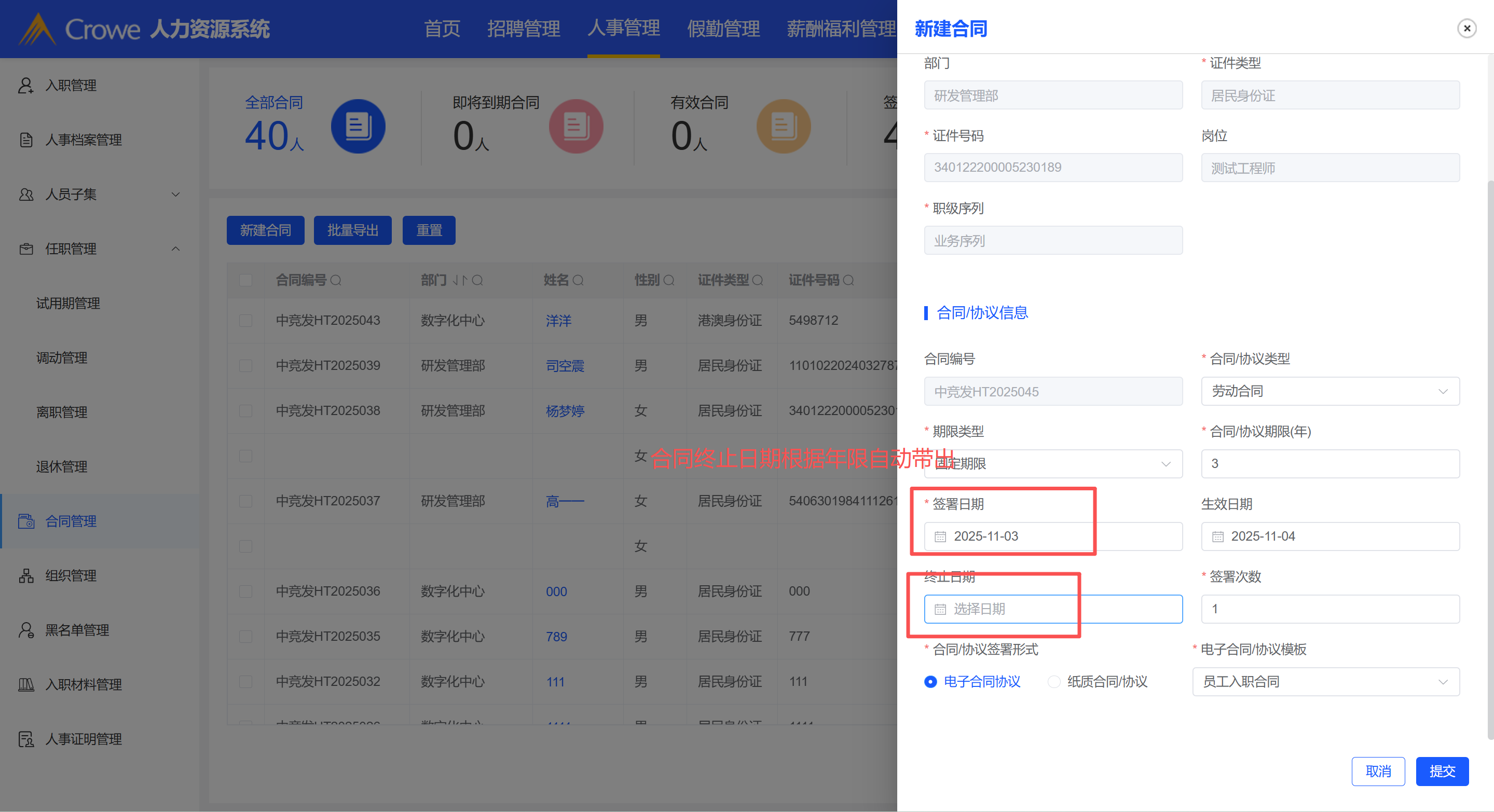 合同签署表单的合同终止日期根据年限自动带出