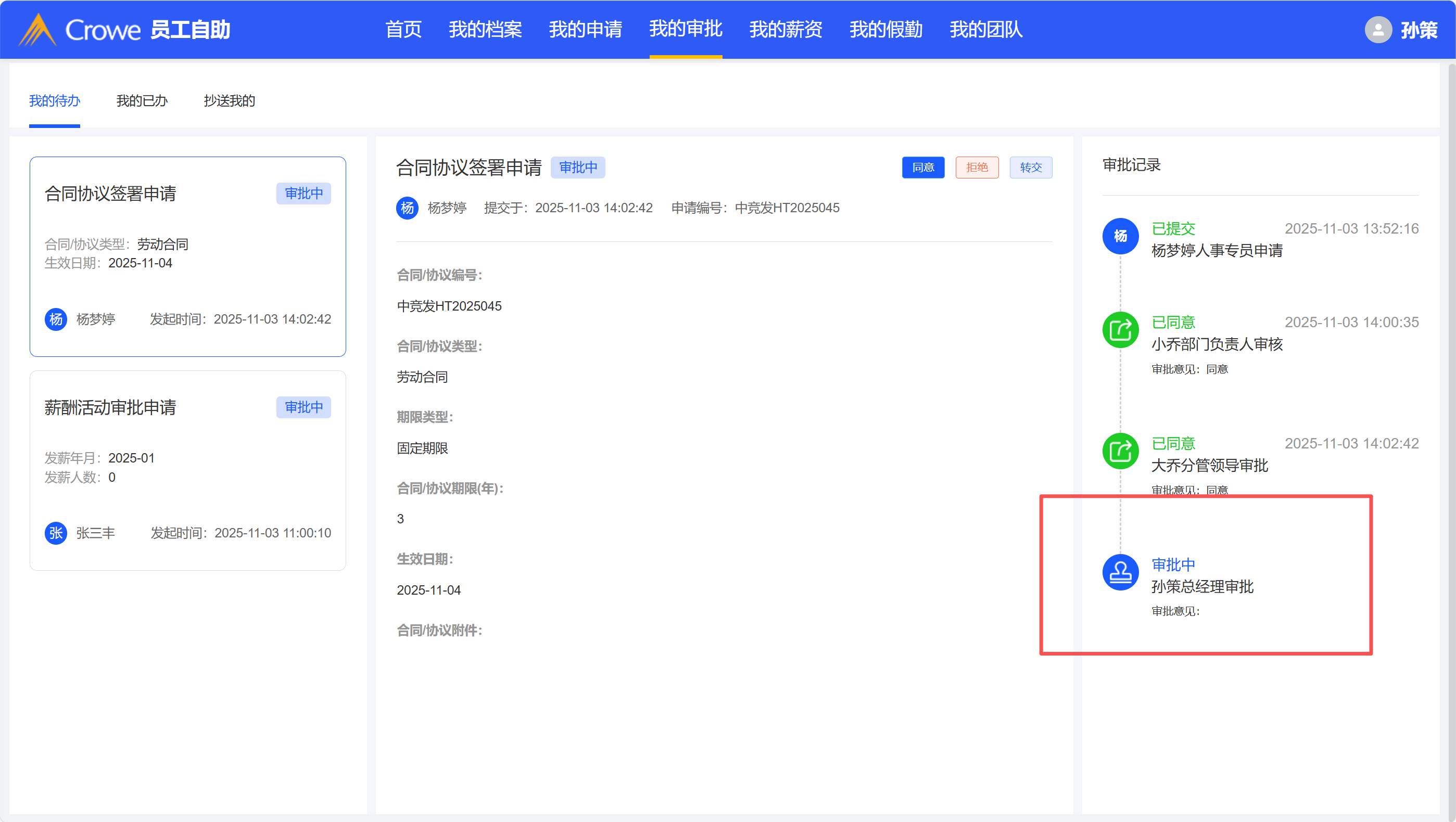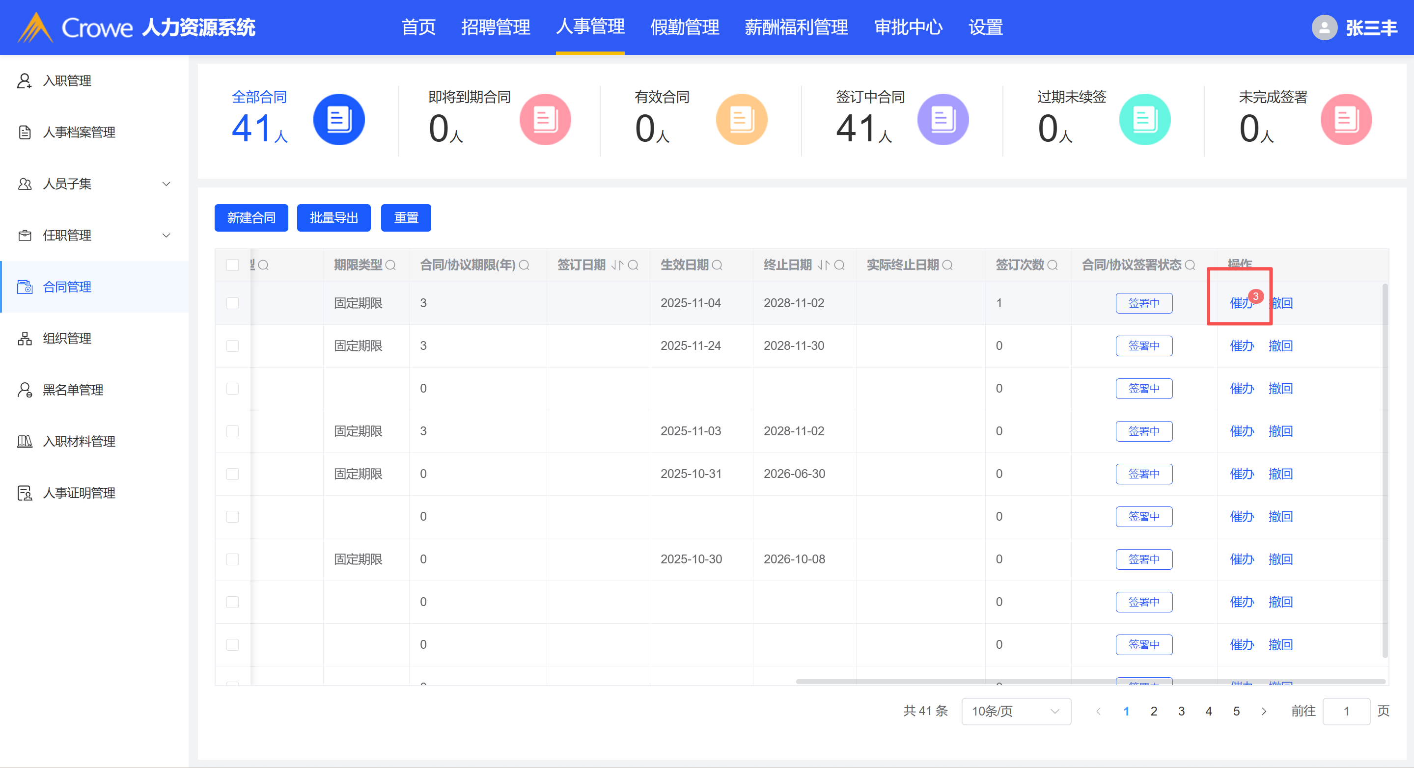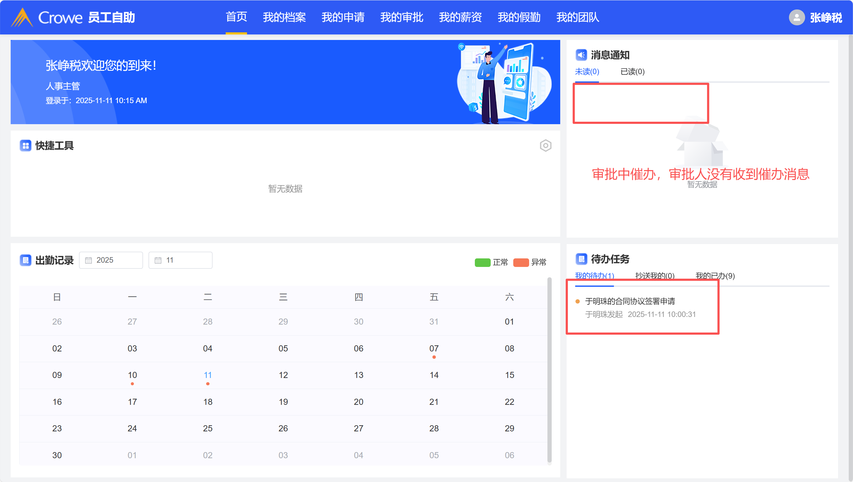 HR发起合同申请,点击催办按钮