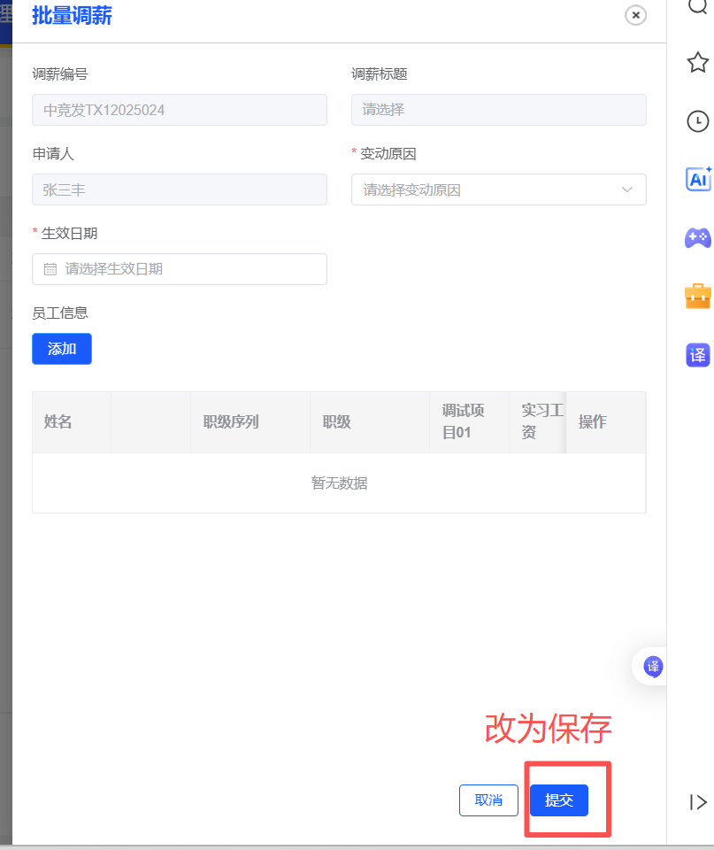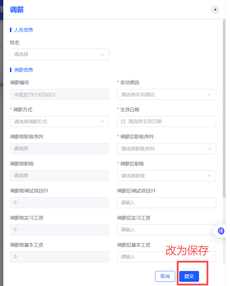 调薪管理--调薪表单 调薪和批量调薪表单中,提交按钮改成保存按钮