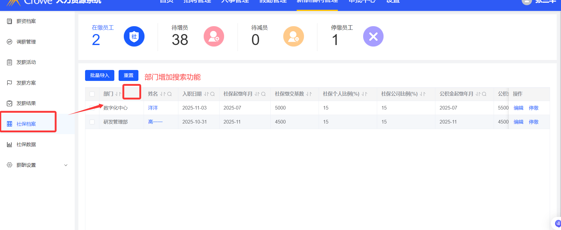 薪酬管理--社保档案,部门字段增加搜索功能