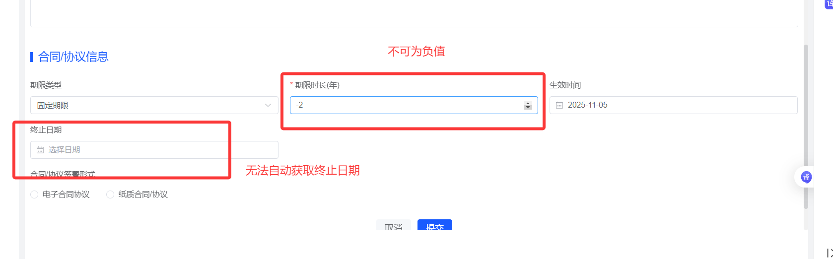入职管理--待入职,点击入职后,选择固定期限,设置期限时长(不可为负值),选择生效日期,无法自动获取终止日期
