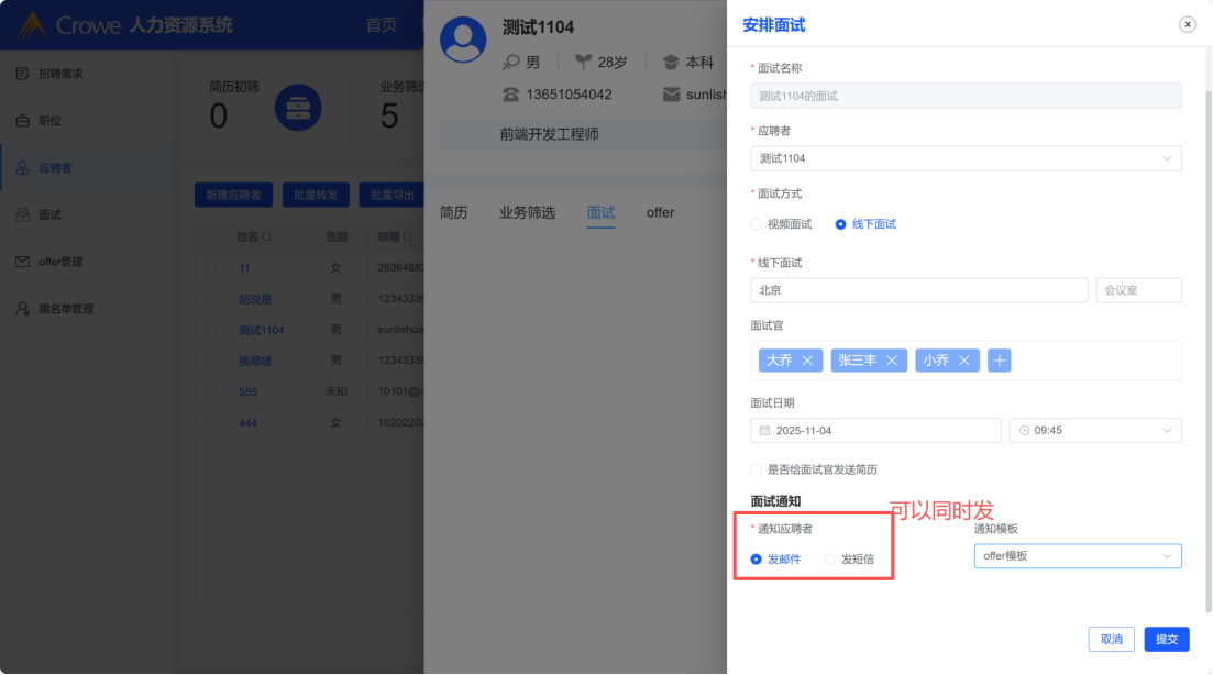 安排面试-面试通知可以发邮件,发软件可以同时选