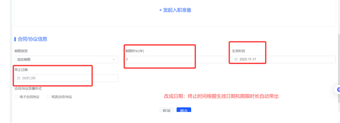入职合同协议信息:“生效时间”改成“生效日期”,“终止日期”不用填根据生效日期和期效时长自动计算