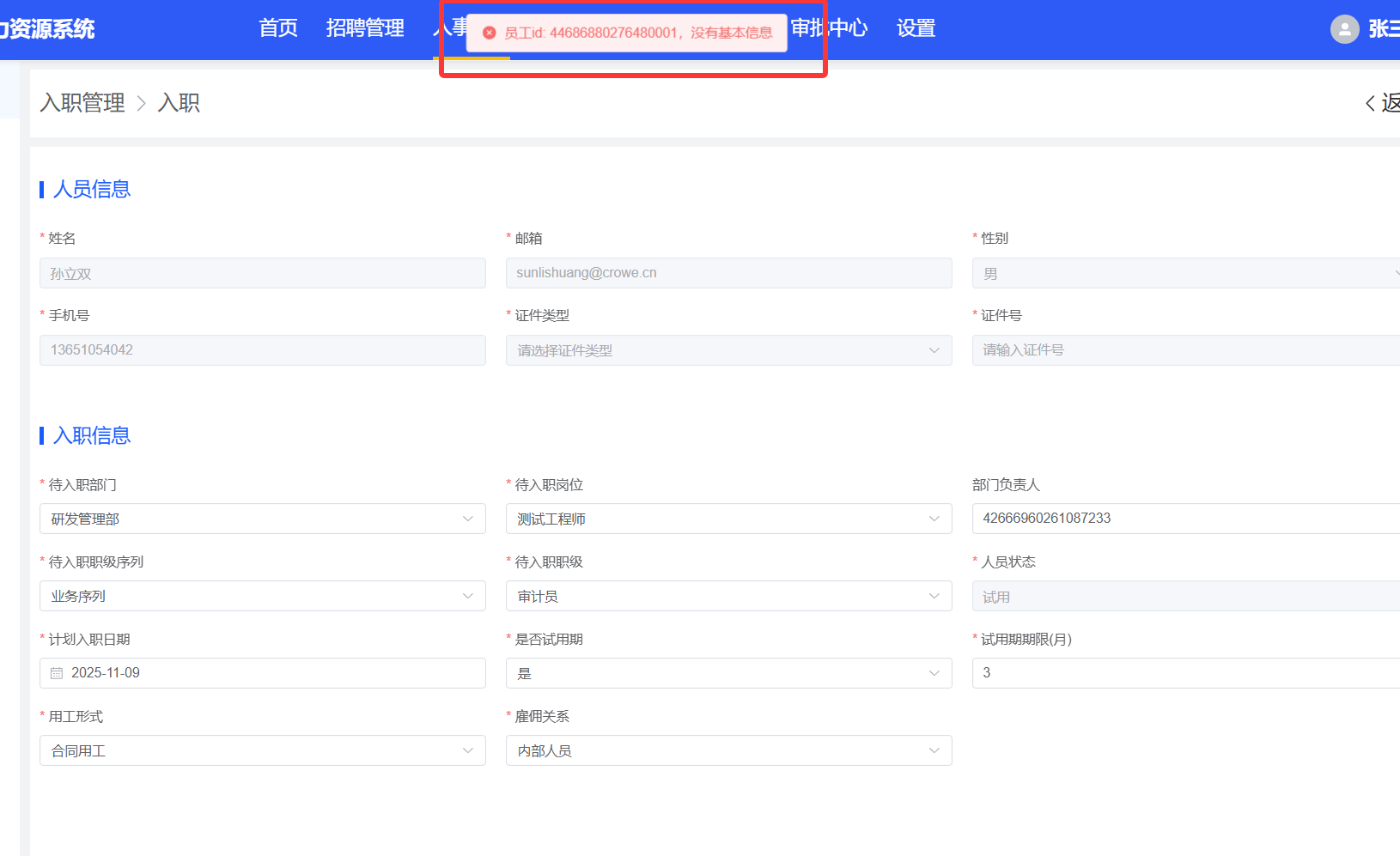 入职管理--待入职,待入职列表中点击入职操作,提交报错