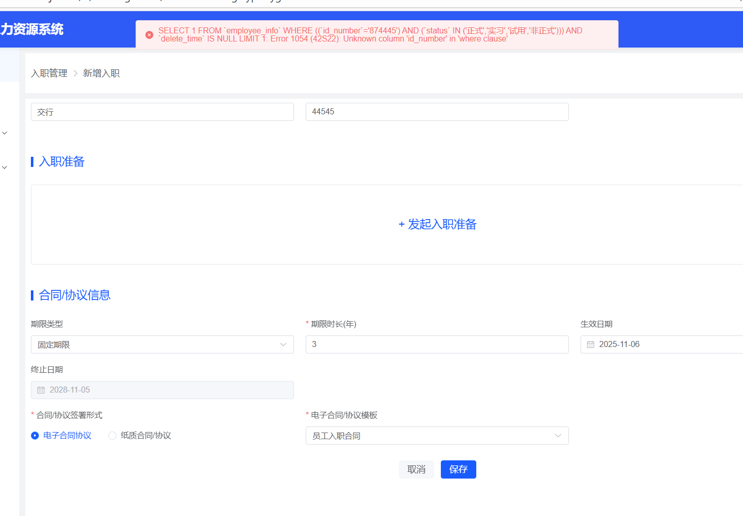 入职管理--新增员工入职。新增报错