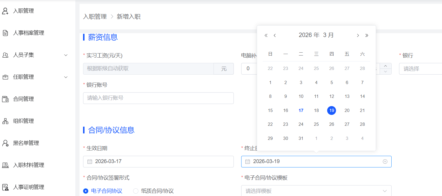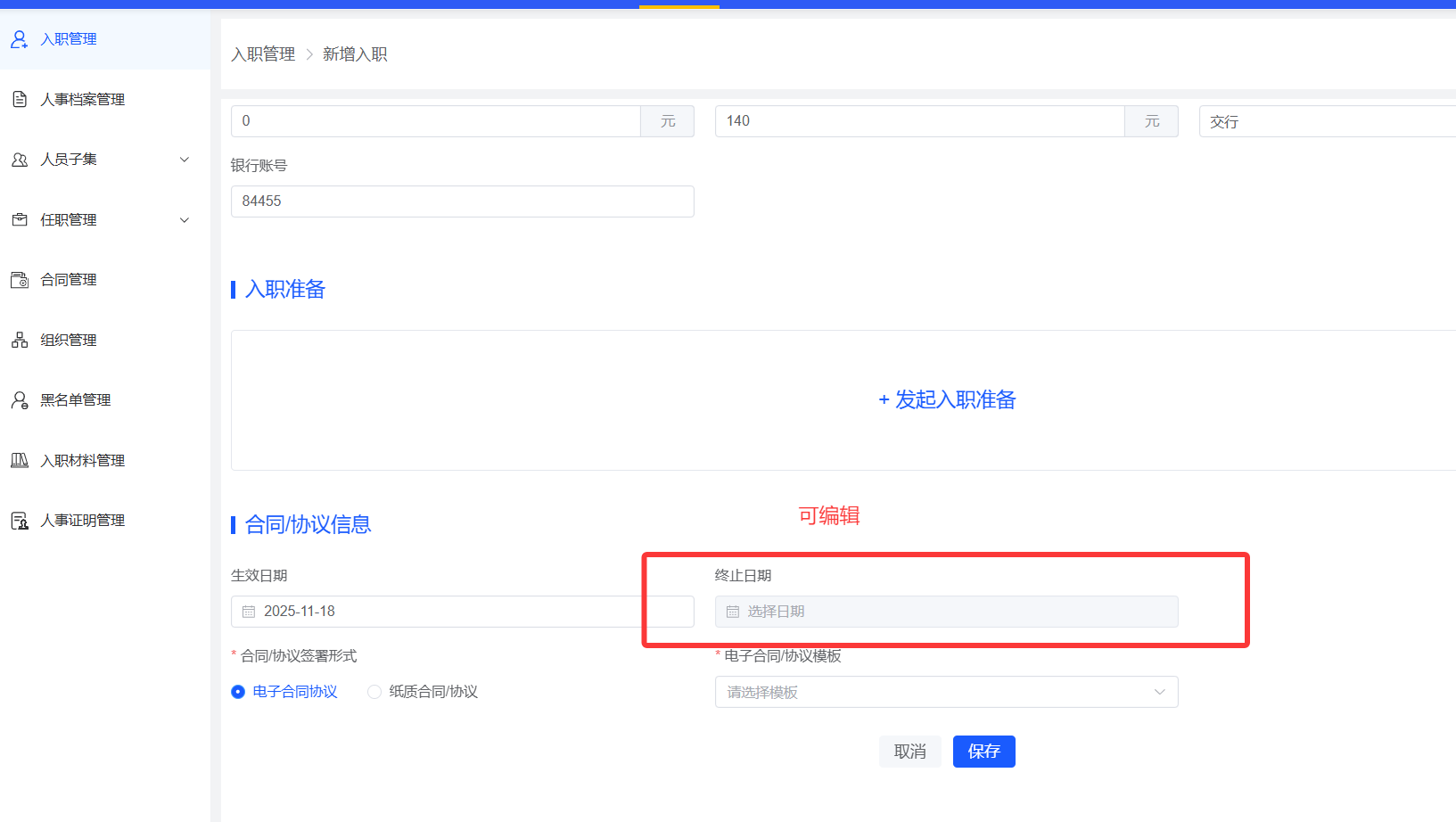 已关闭入职管理--新增实习生入职。合同终止日期可编辑(晚于生效日期)