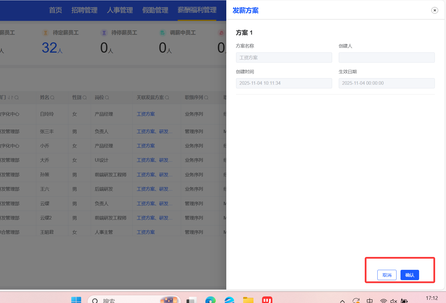 薪资档案,查看发薪方案页面,删除取消和确认按钮