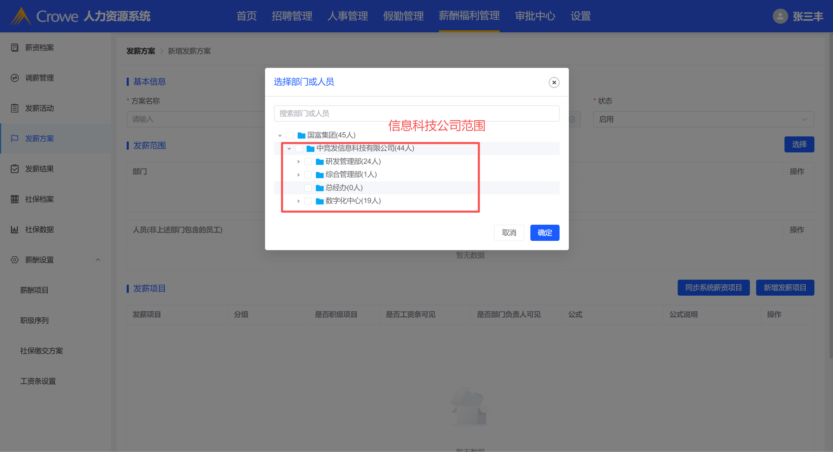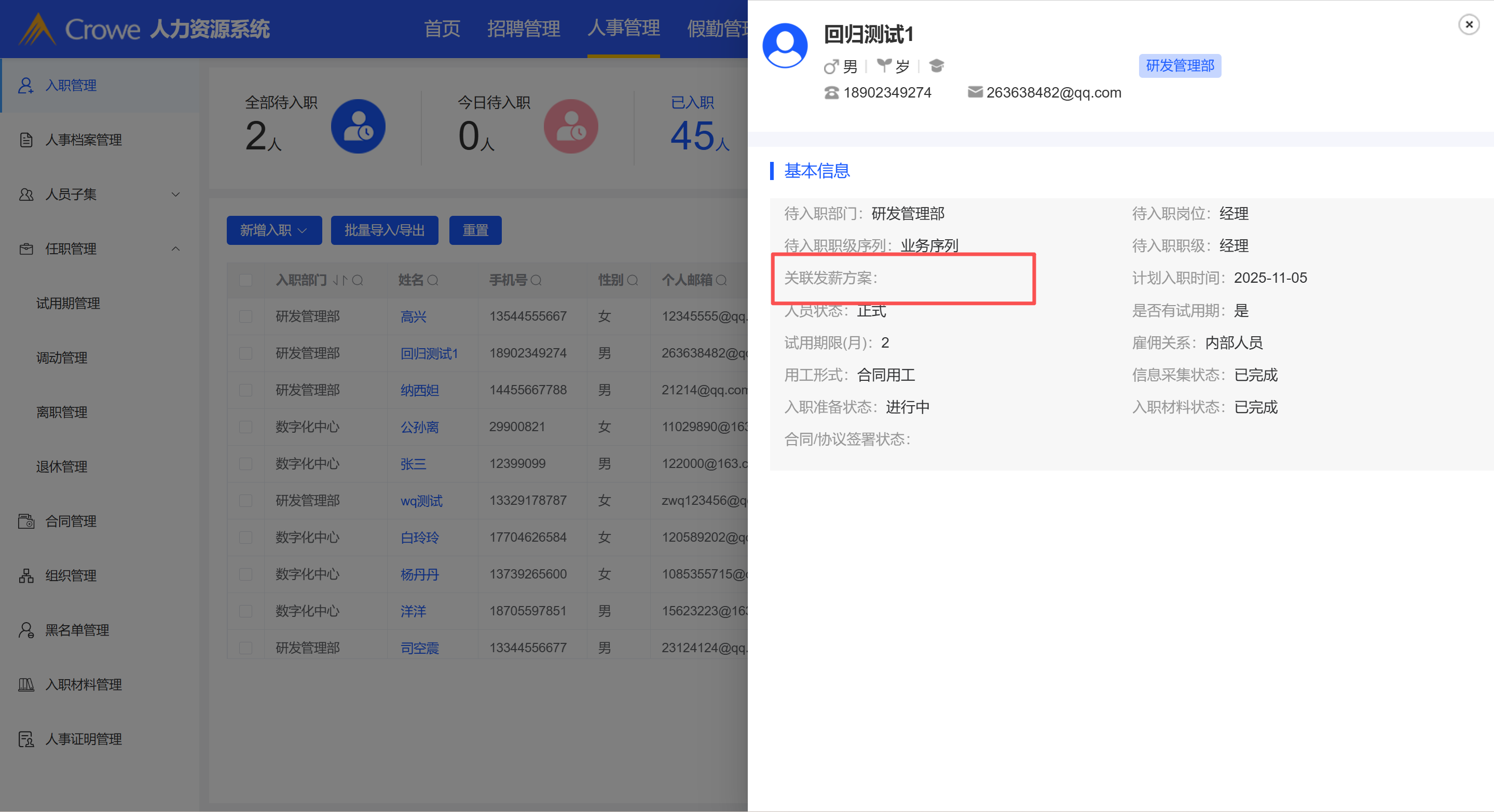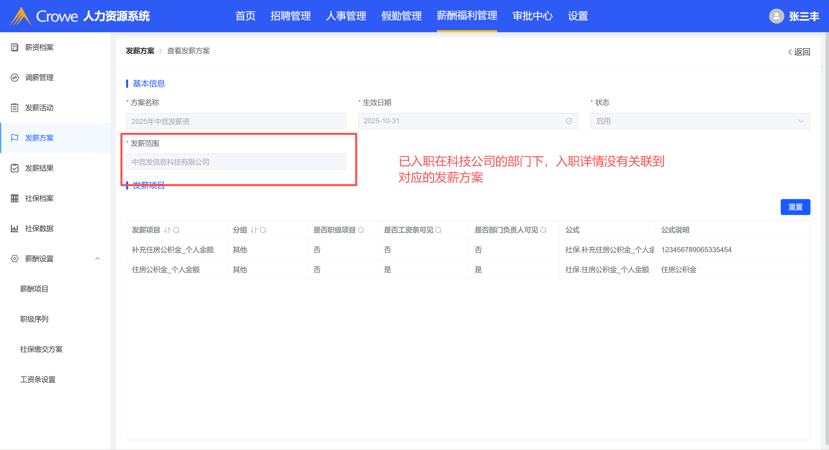已入职在科技公司的部门下,,入职详情没有关联到对应的发薪方案