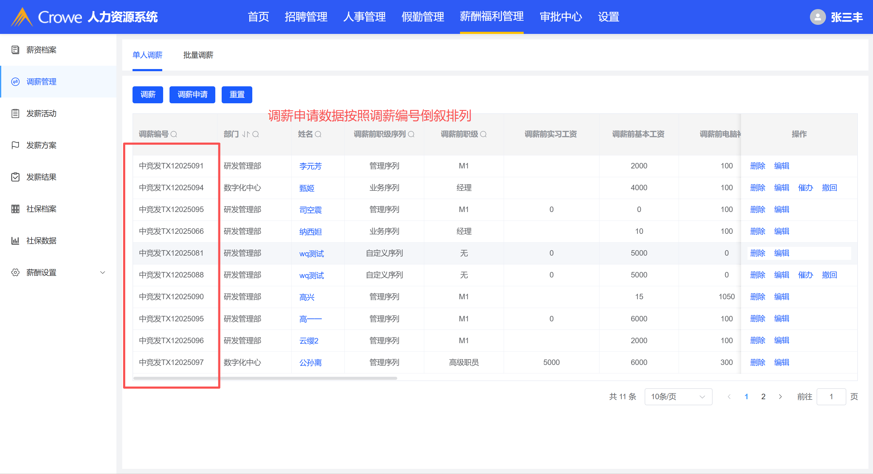 调薪申请数据按照调薪编号倒叙排列