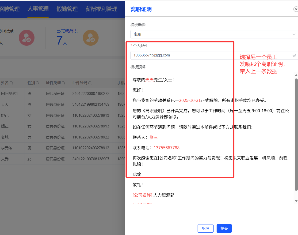 任职管理--离职管理中,完成离职发送离职证明后,点击其他员工发送离职证明,上一条数据没清