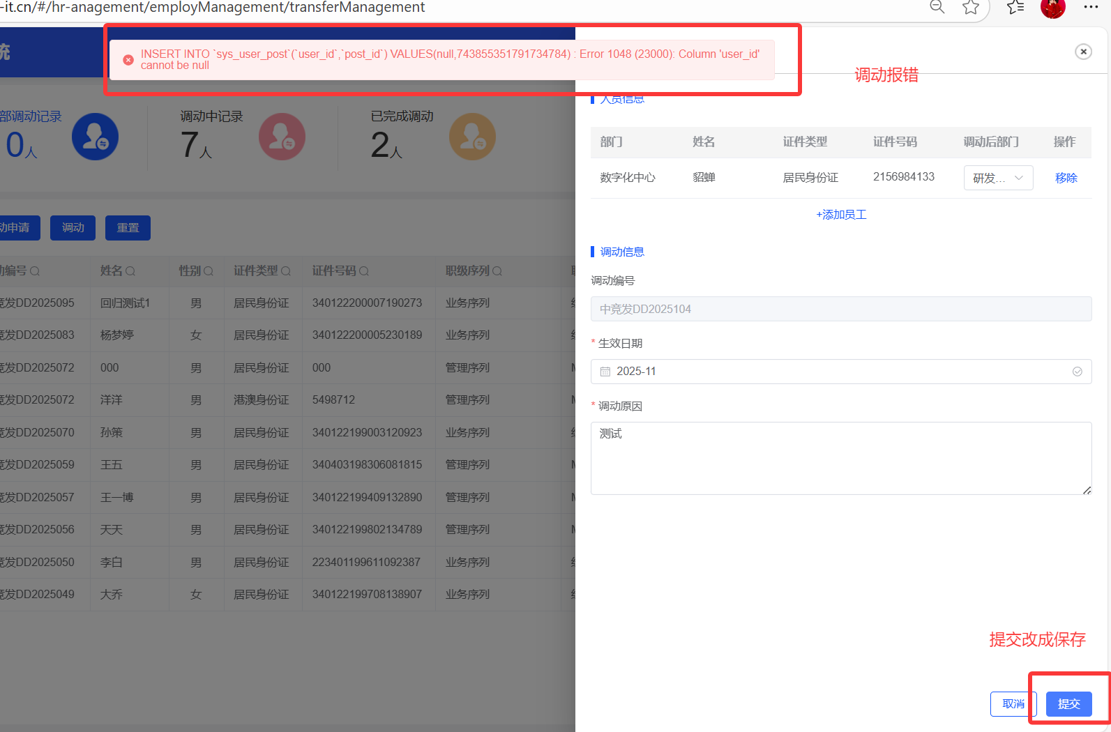 任职管理--调动管理,调动操作,提交报错,提交按钮改成保存
