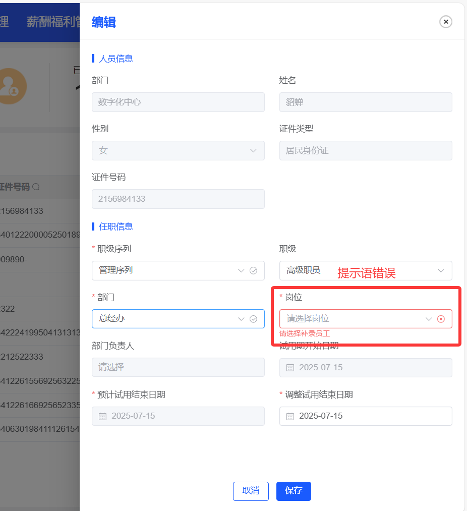 任职管理--试用期管理(试用期员工),编辑操作中,岗位字段提示语有误