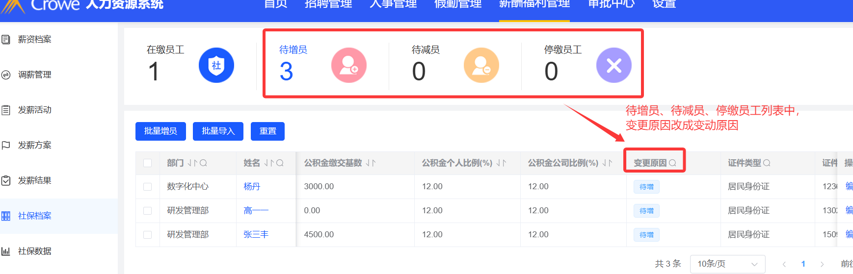 社保档案--待增员、待减员、停缴员工列表中,变更原因改成变动原因