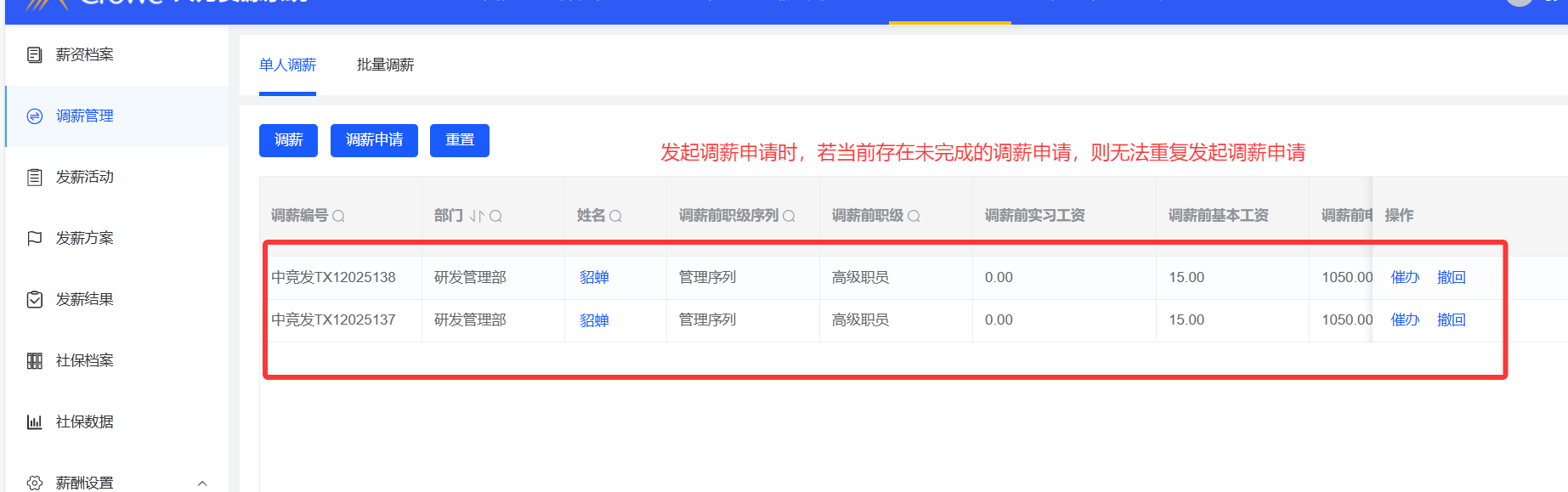 调薪管理--调薪申请,若存在该员工正在审批中的调薪申请,则无法对该员工进行调薪申请