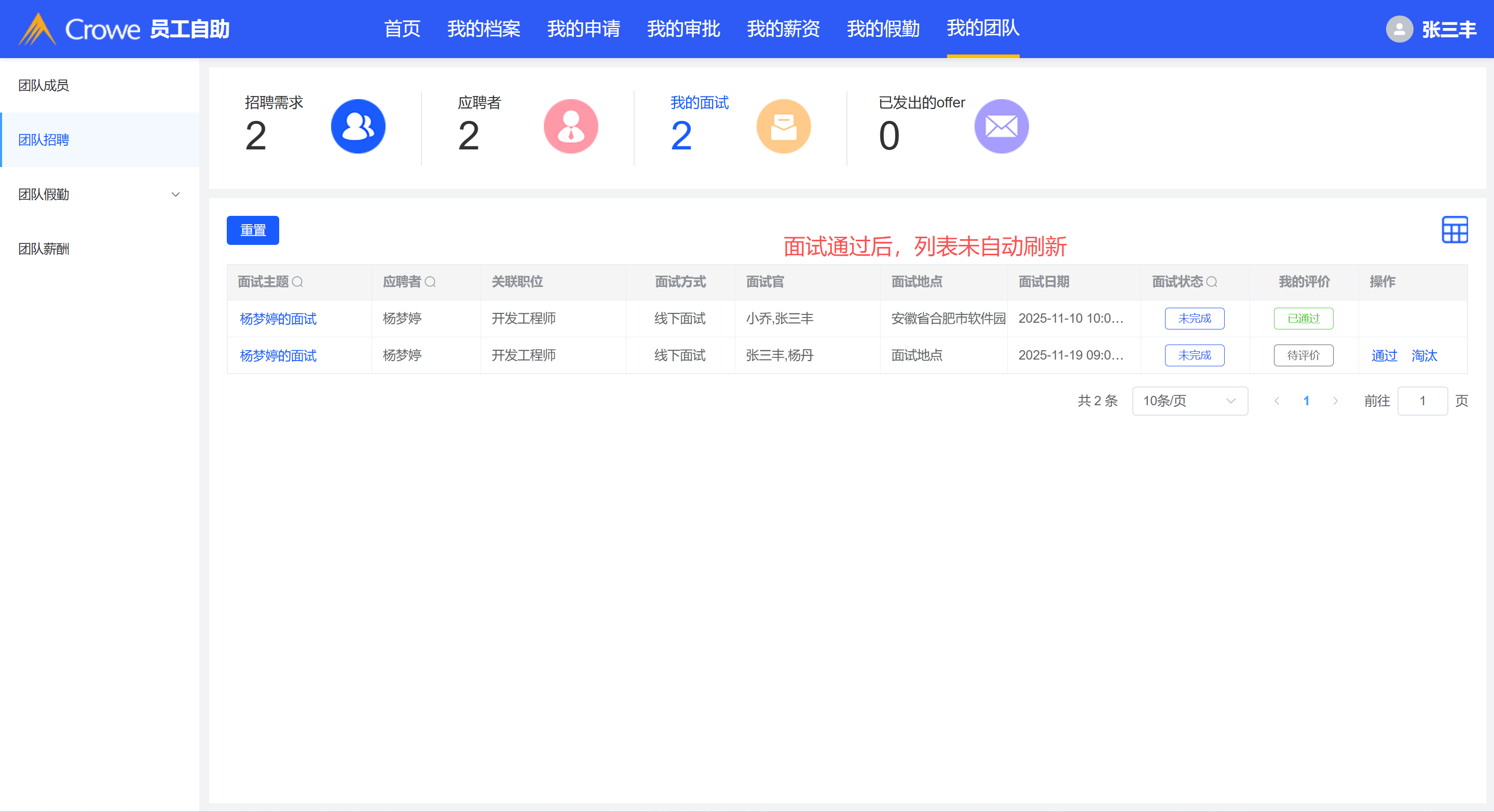 面试官通过面试后,面试列表需要自动更新