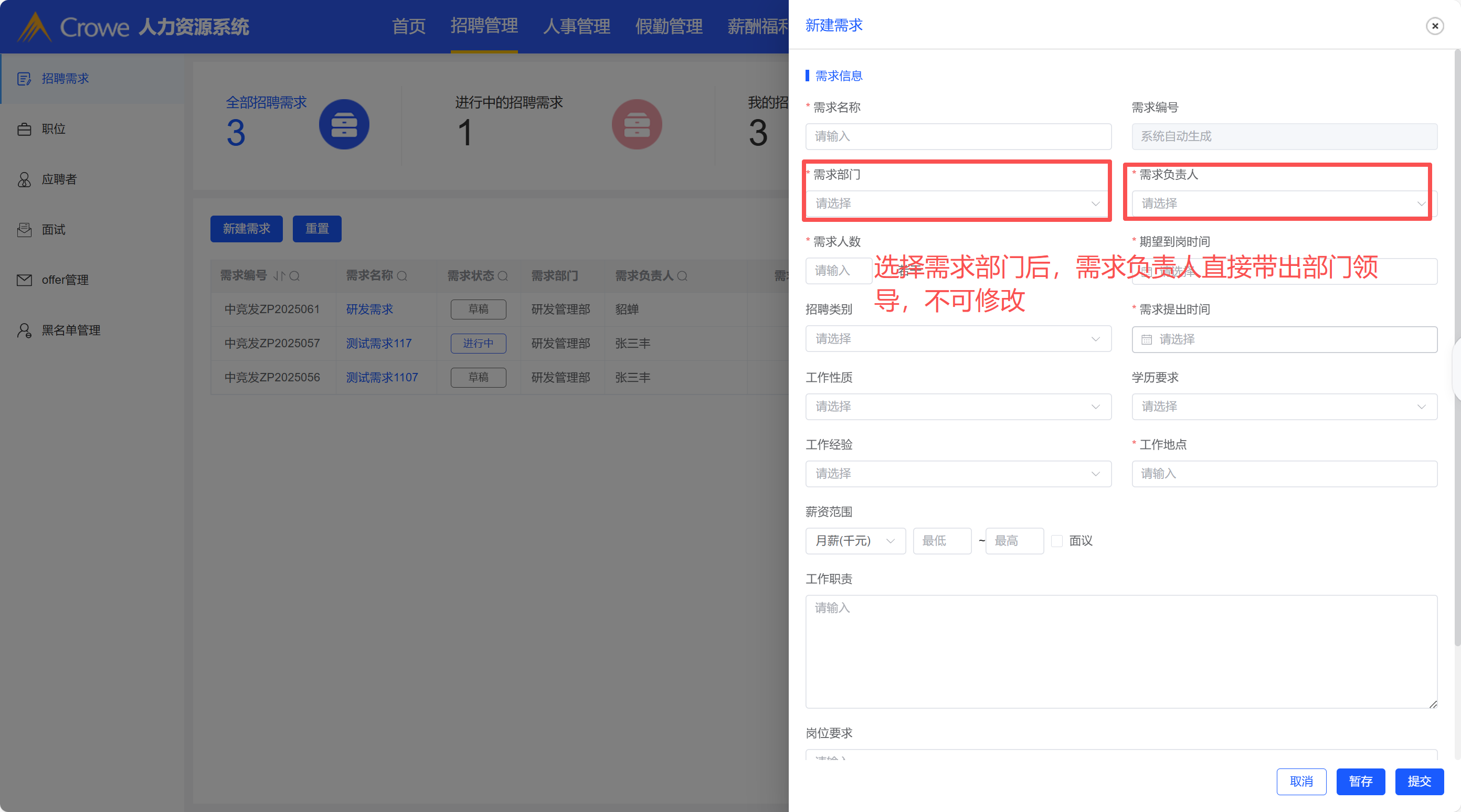 招聘需求-新建需求,选择部门后,需求负责人直接带出部门领导,不可修改