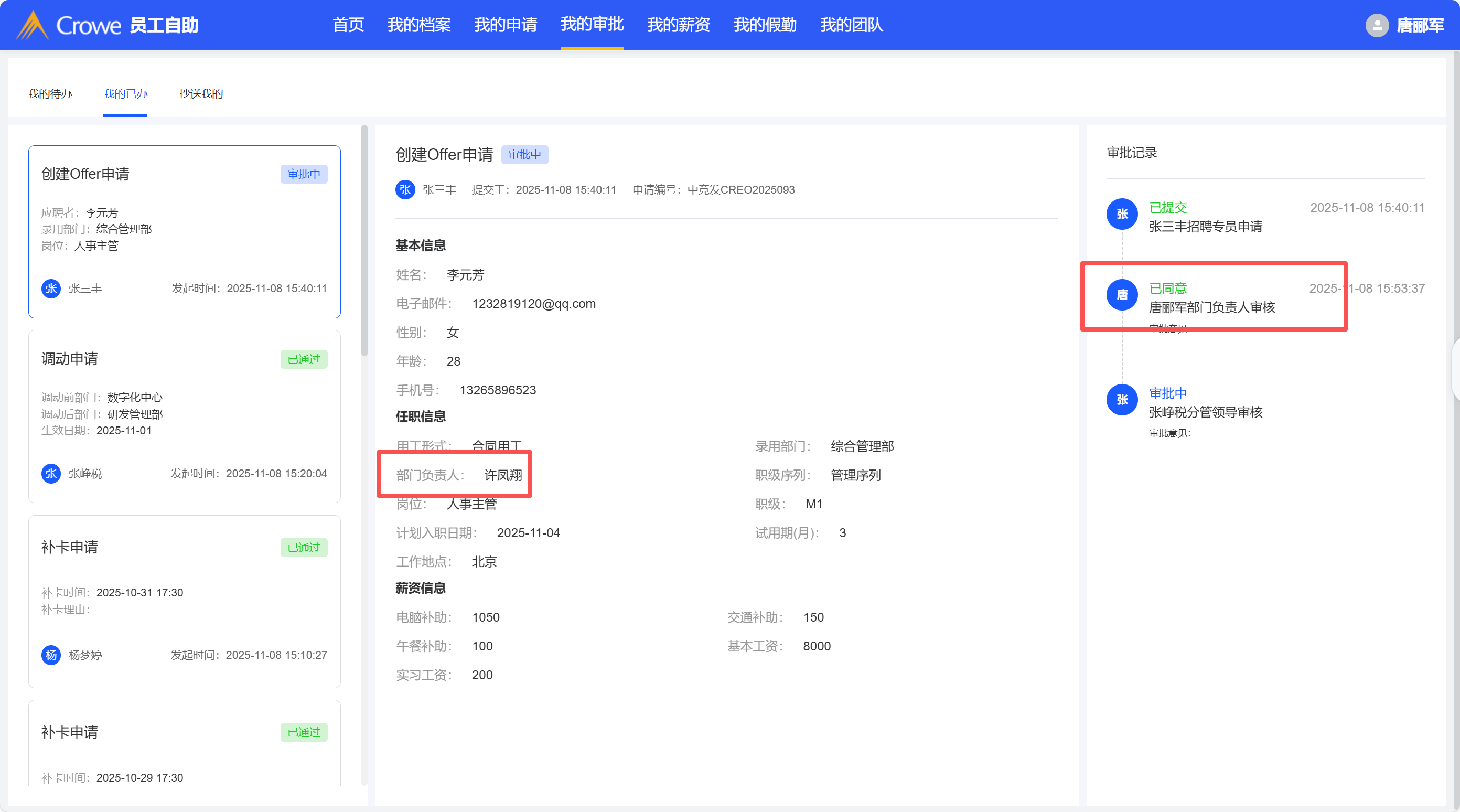 已关闭创建Offer审批,表单中的部门负责人和审批的部门负责人应该一直