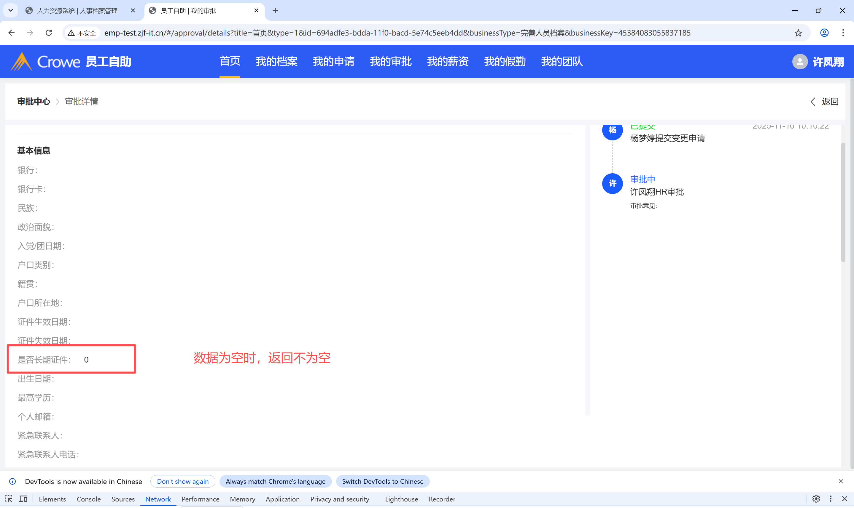 人员档案是否为长期证件未变更时,返回为0