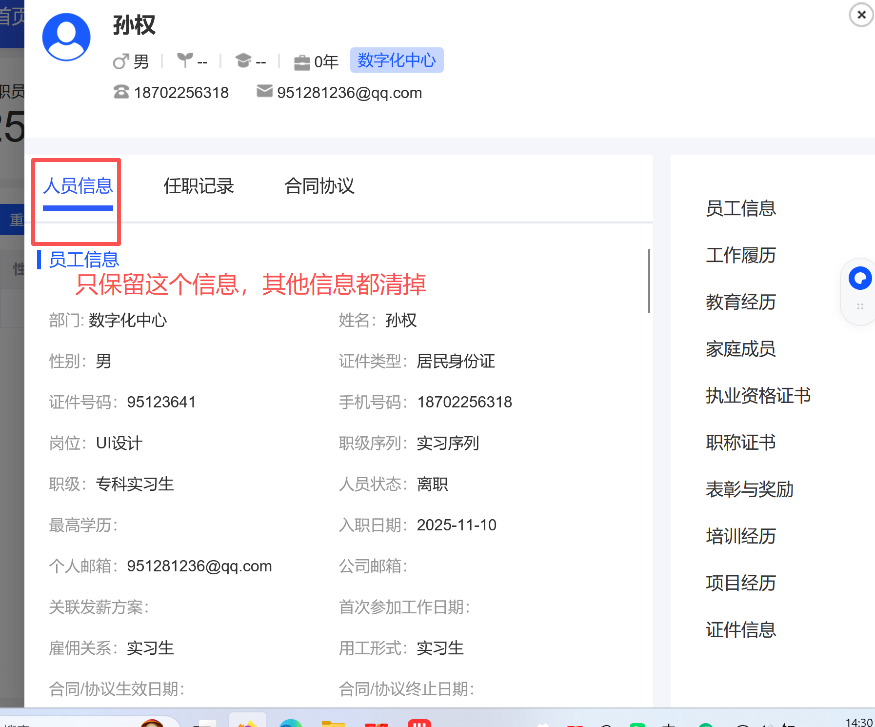 人员状态=离职,退休的员工,可以重新添加入职(只用身份证号码验证唯一性),重新入职时只保留基本人员信息,其他信息全清空