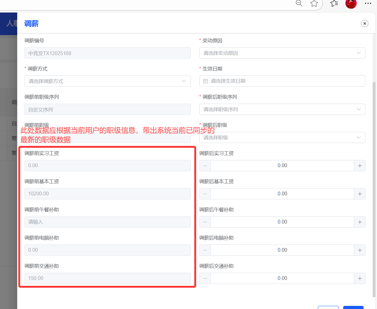 薪酬管理--调薪管理,调薪表单中,带出系统已同步的最新的职级序列字段及数据