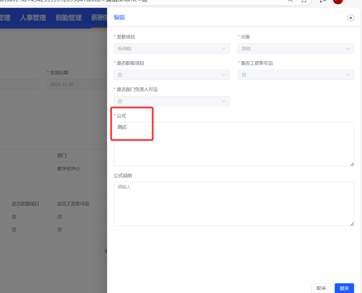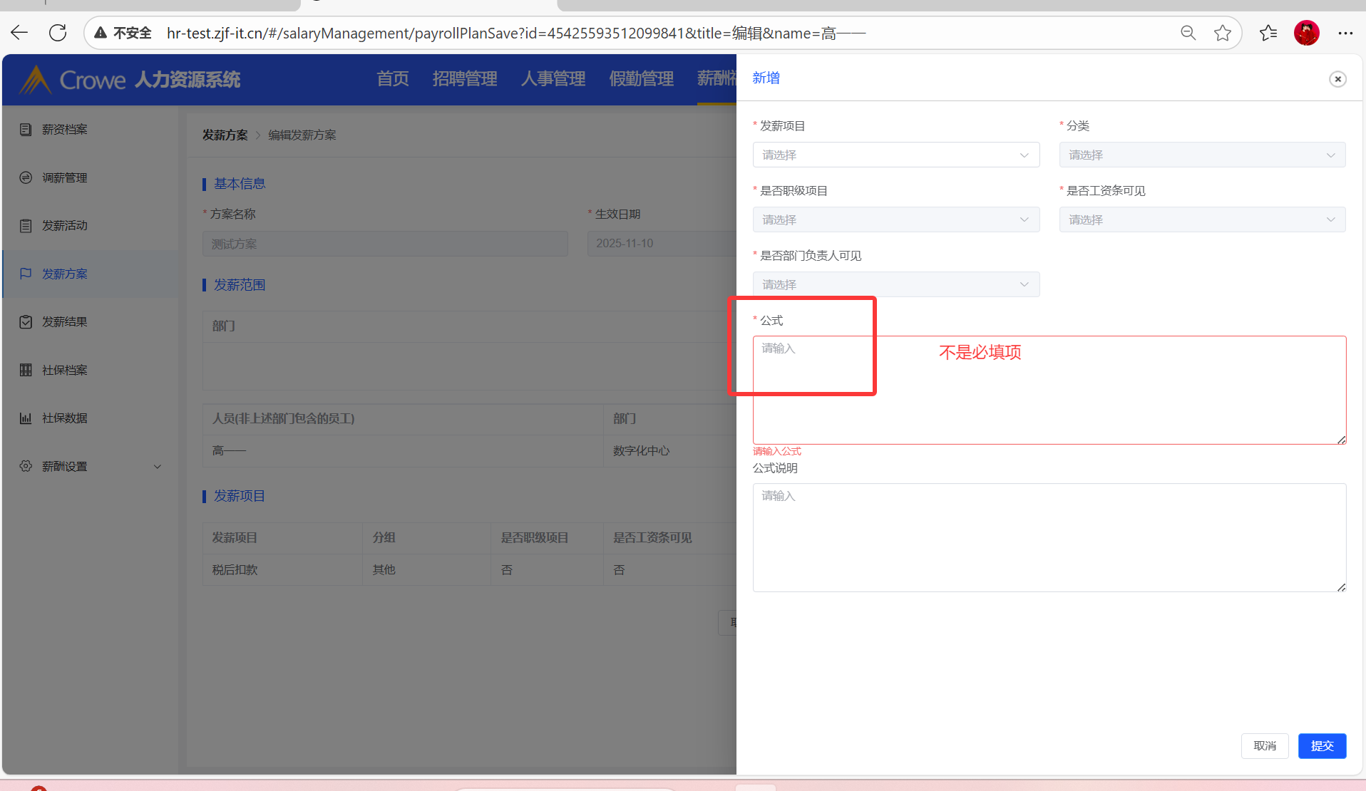 新建或者编辑发薪方案的时候,新增单个发薪项目或者编辑某个发薪项目,公式字段改为非必填项
