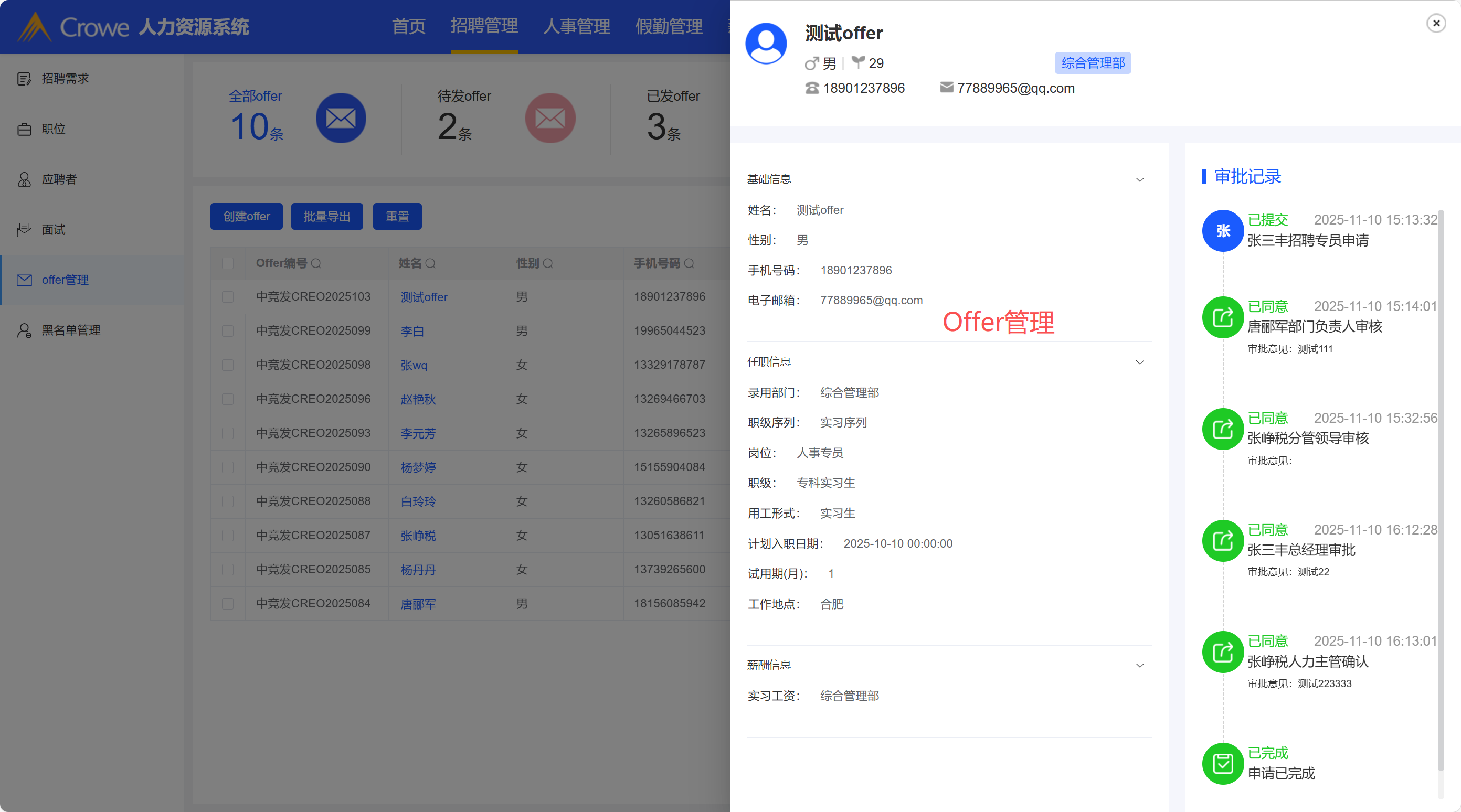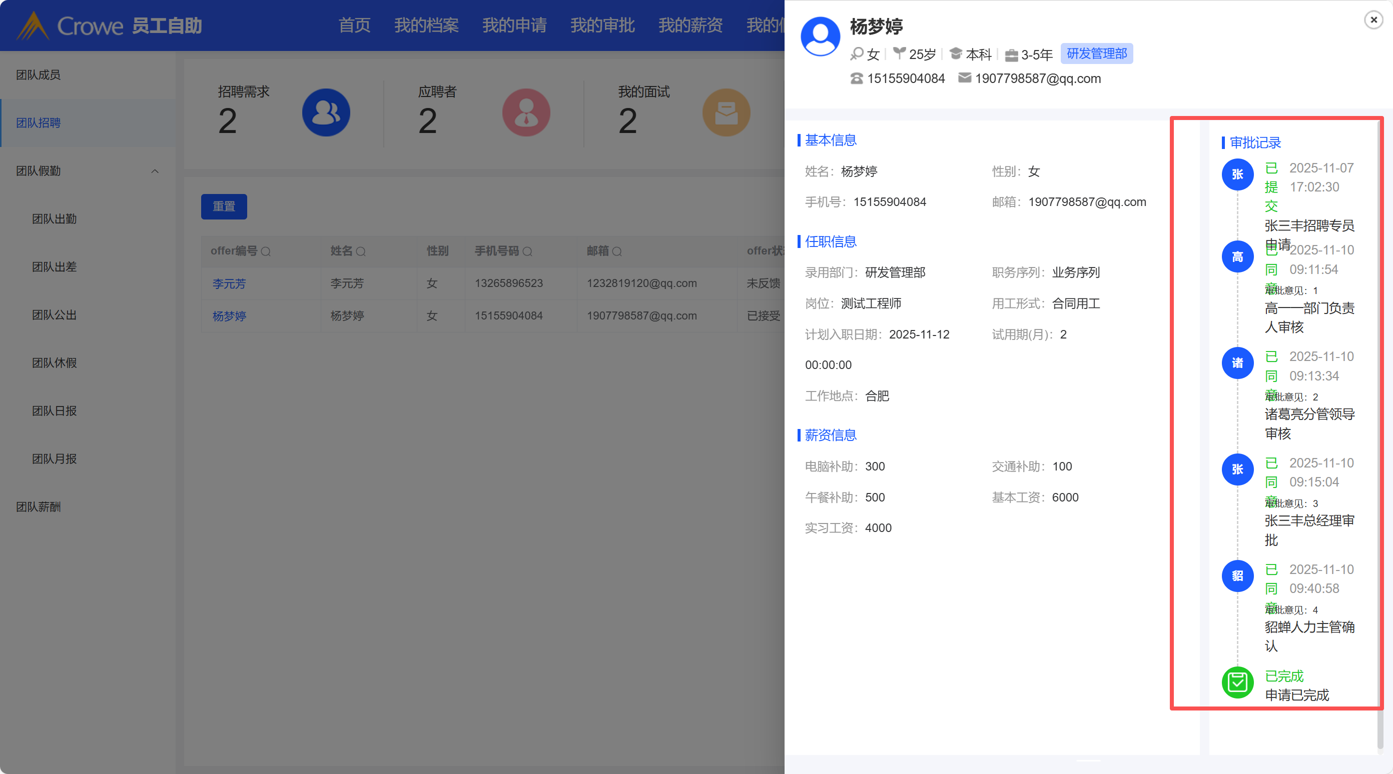 团队招聘-已发出Offer ,点击姓名,详情页面抽屉大小调整,抽屉占页面50%或60%