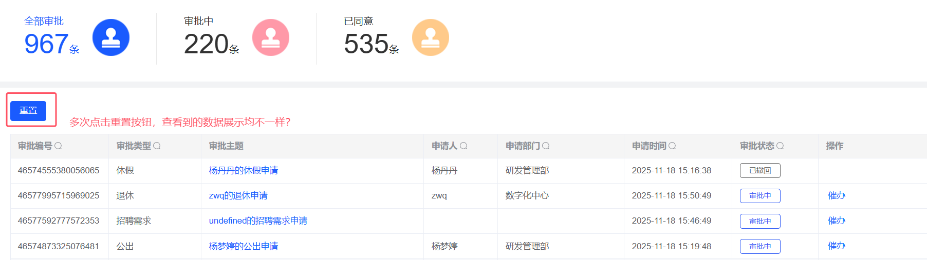 多次点击重置按钮,展示的数据均不一样,是按照什么排序?