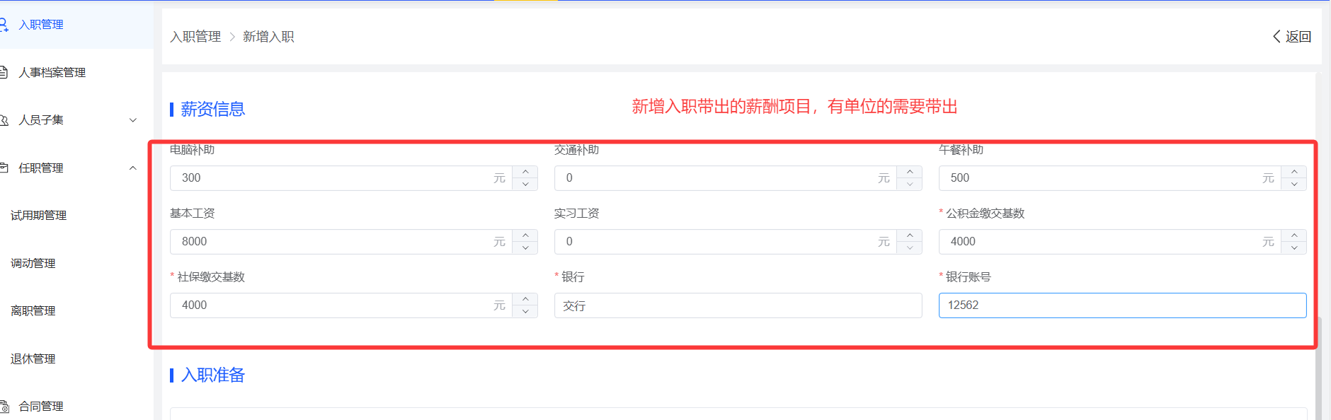 入职管理--新增入职,薪资项目数据有单位的需要带出单位信息