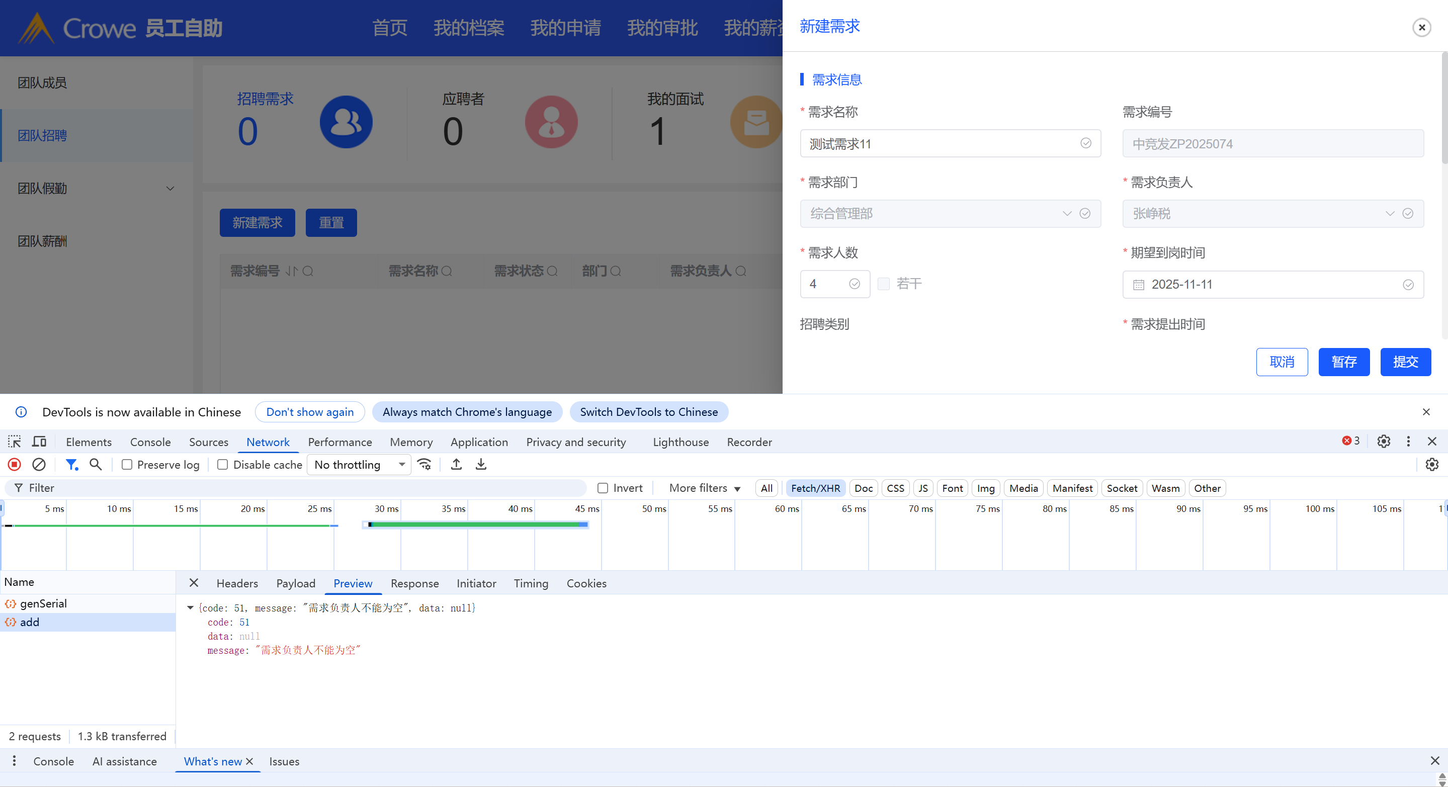 员工自助-我的招聘新建需求接口报错