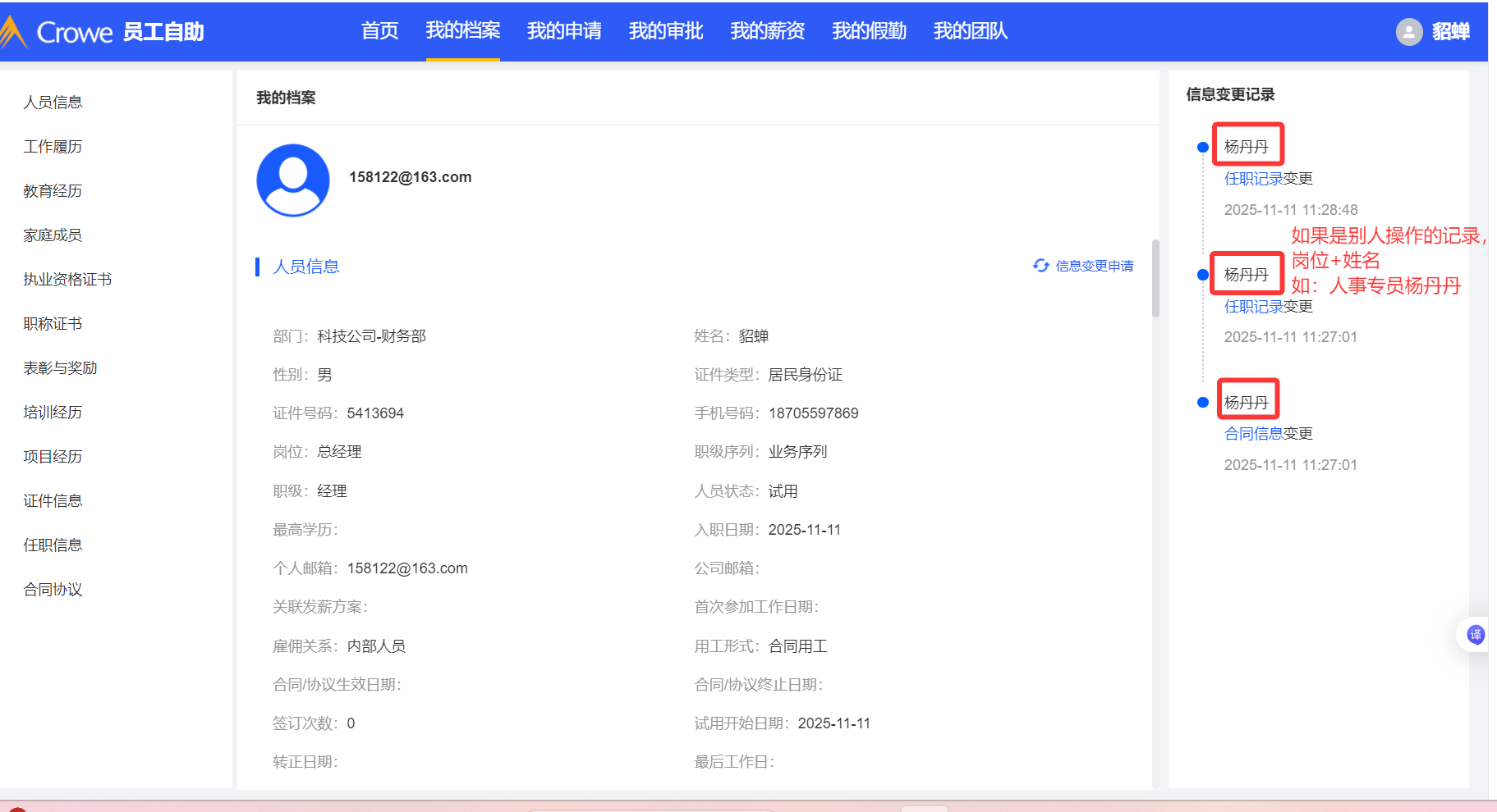 员工自助--我的档案中,信息变更记录,由其他人操作产生的记录,应带出操作人岗位