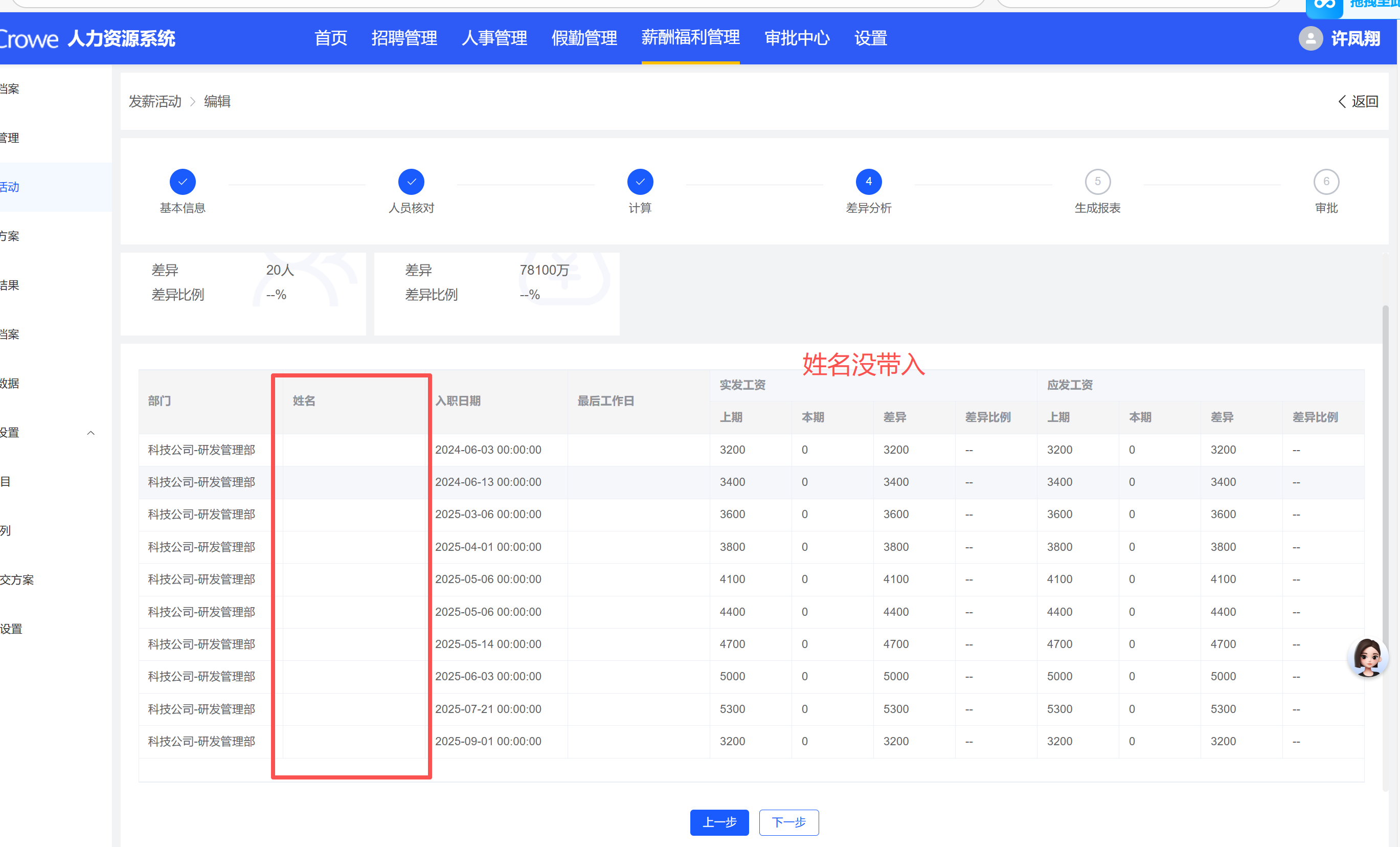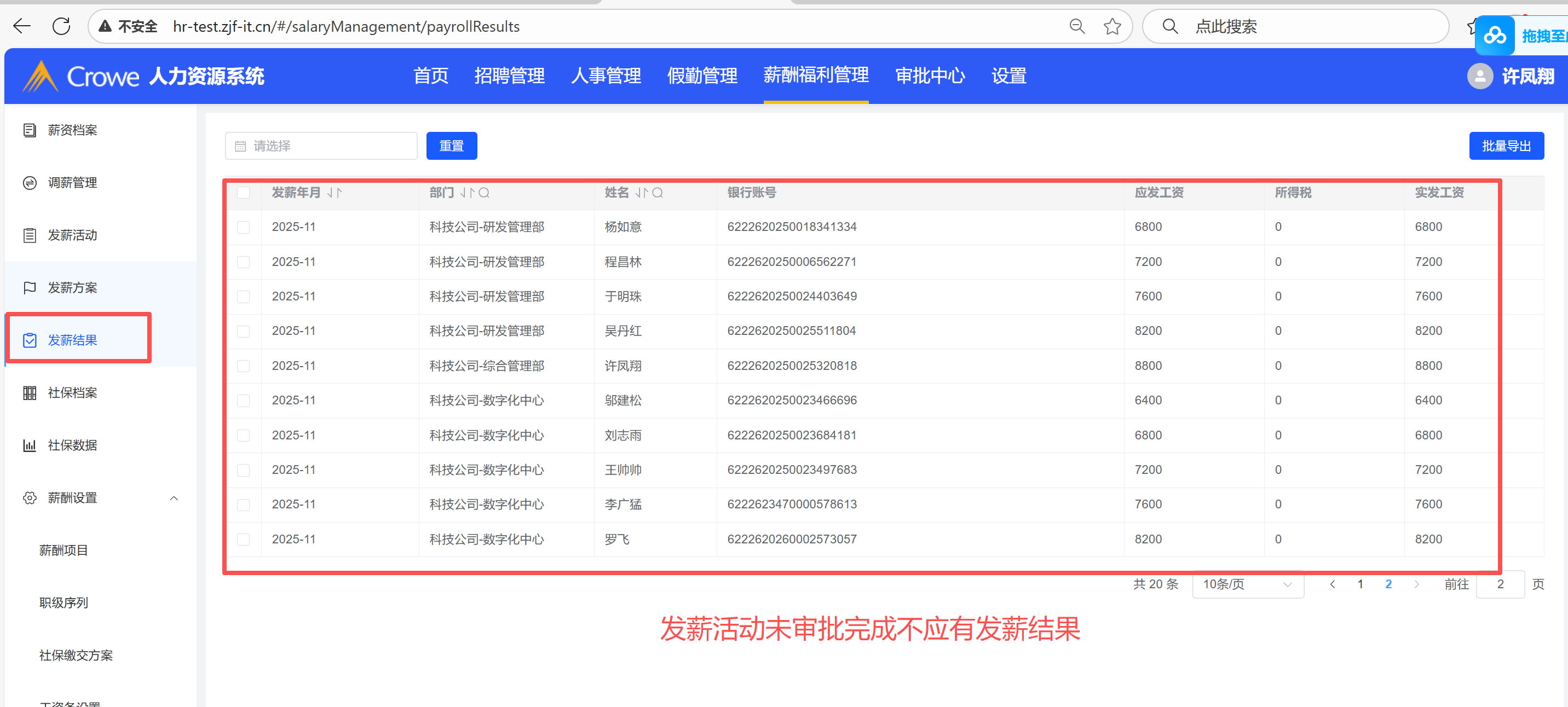 发薪结果-发薪活动未完成不应有发薪结果;发薪活动界面-姓名未带入;发薪结果与发薪活动人员信息对不上