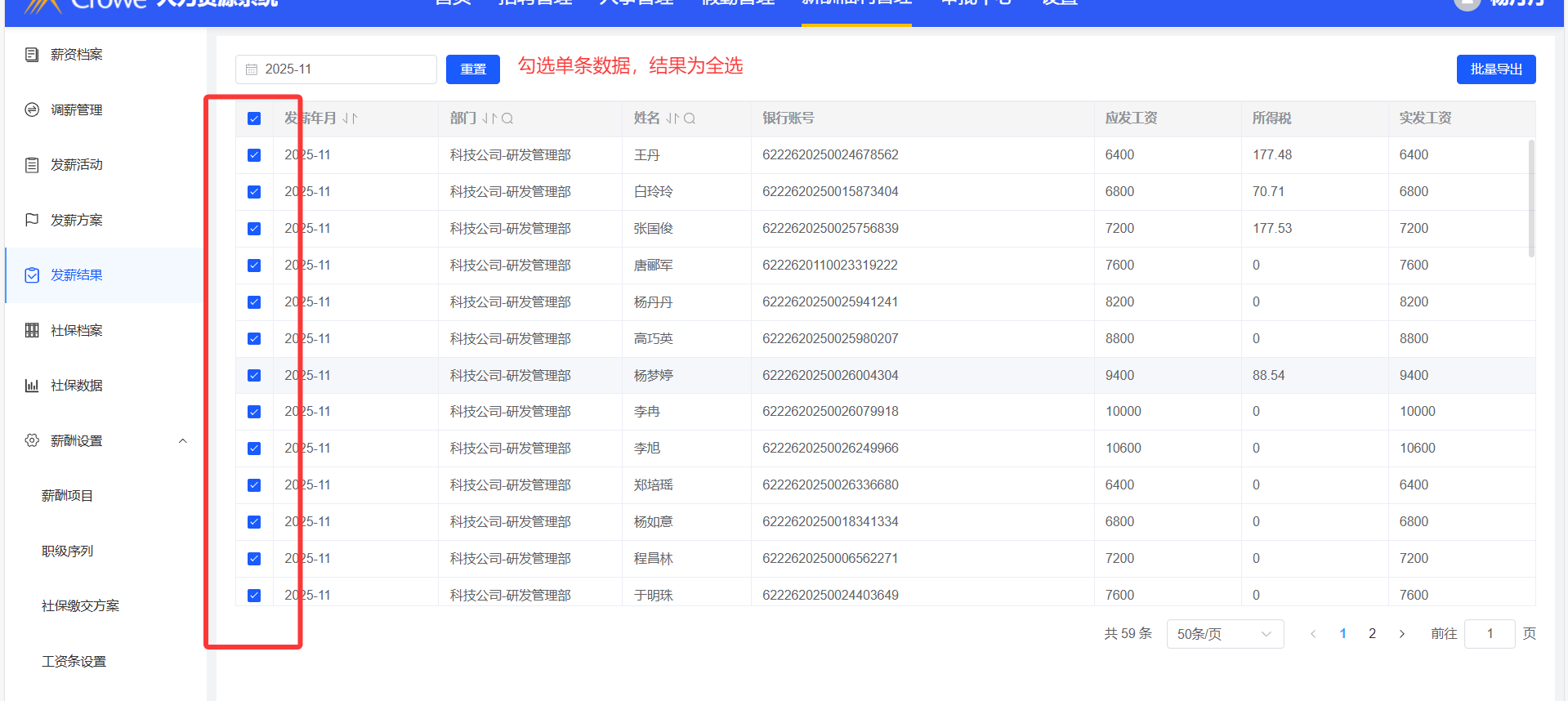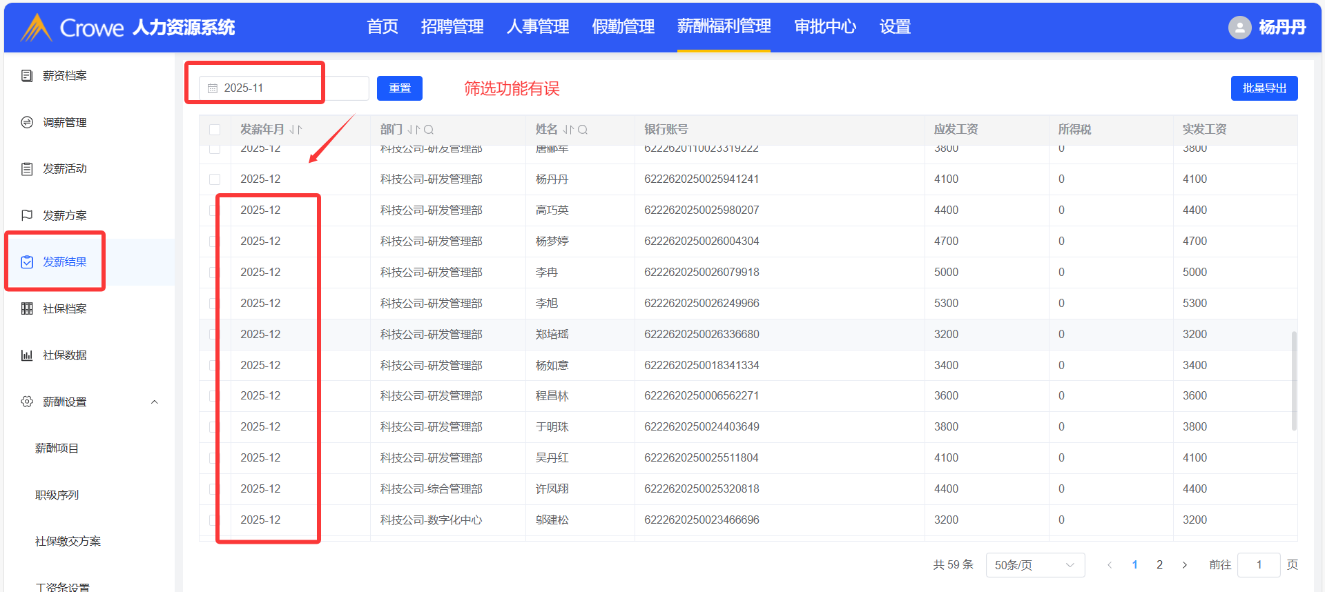 发薪结果中,日期筛选功能有误;勾选单条数据时,结果为全选