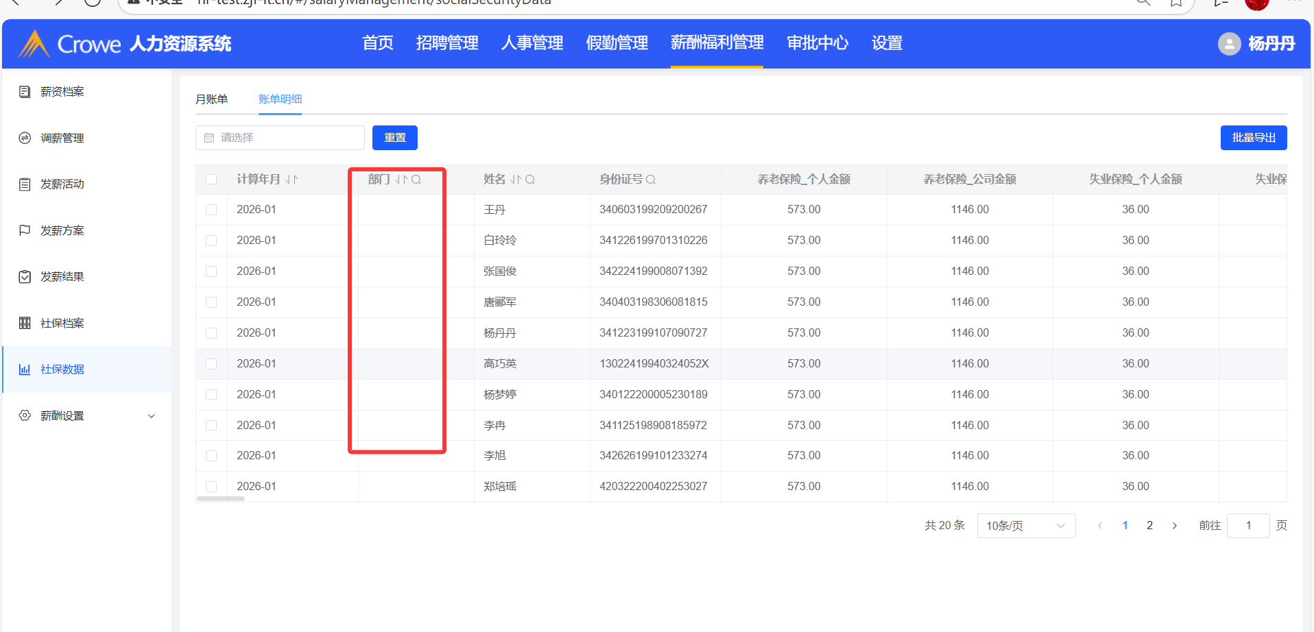 社保数据--账单明细列表中部门数据为空
