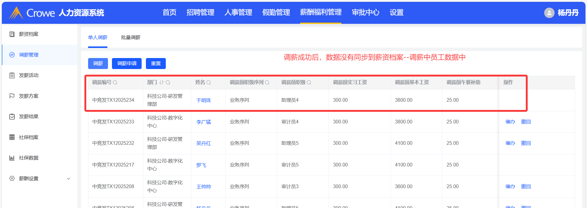 调薪管理,调薪成功后,数据没有同步到薪资档案--调薪中员工