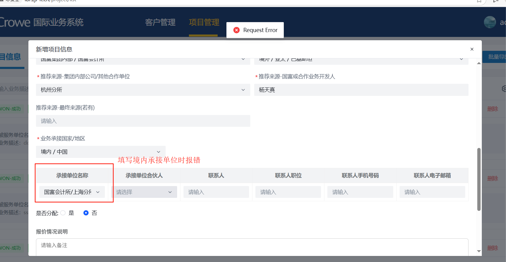 填写境内承接单位时报错