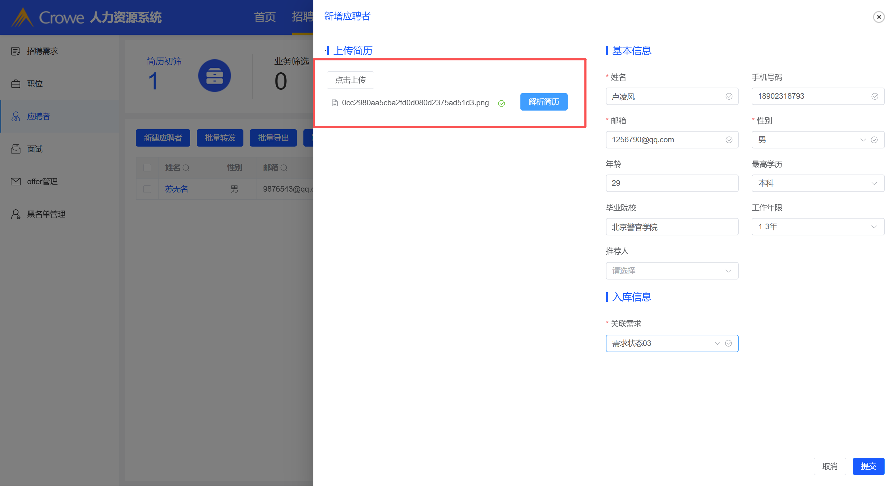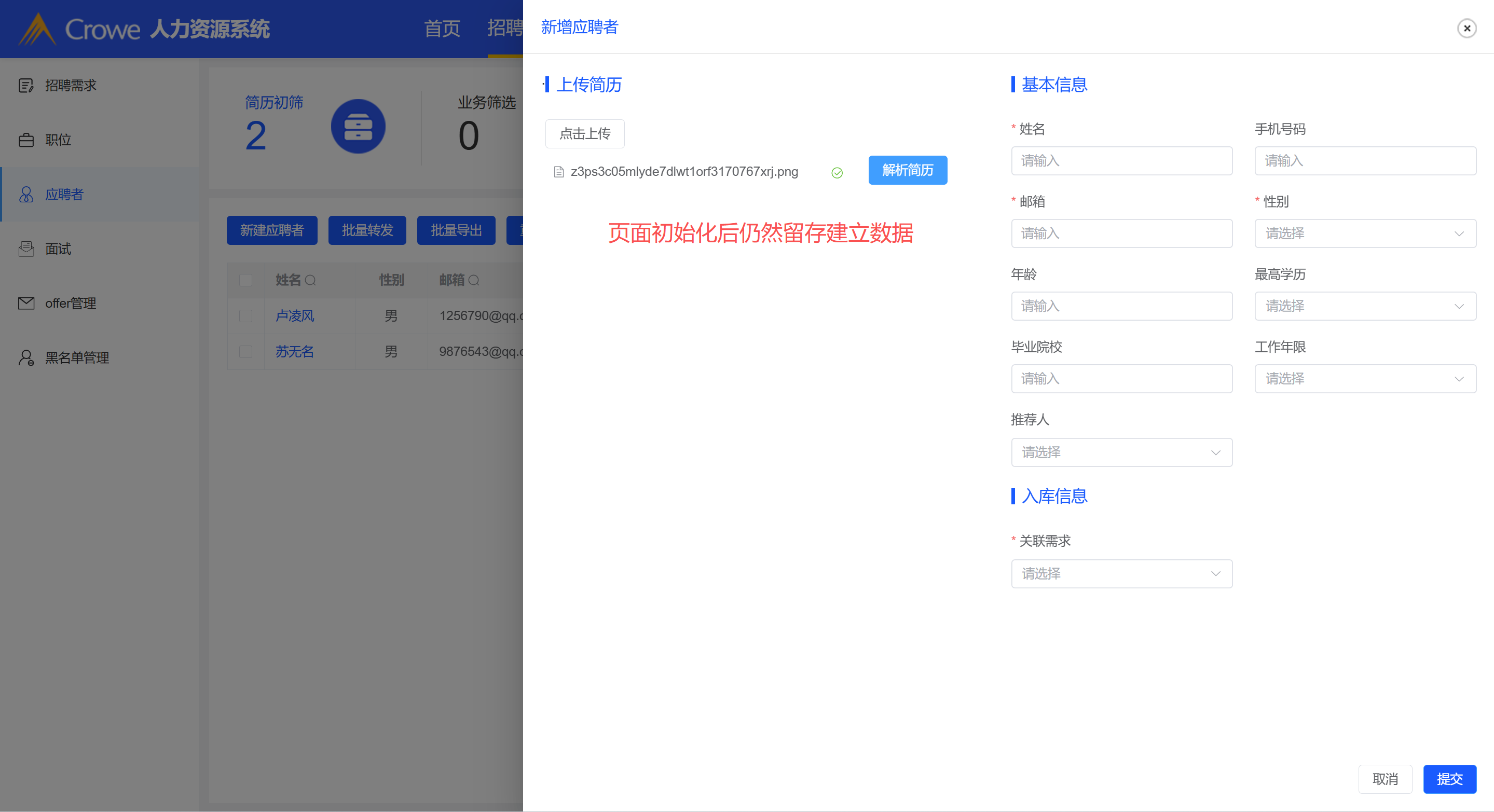 新建应聘者完成后,页面上传的简历未初始化