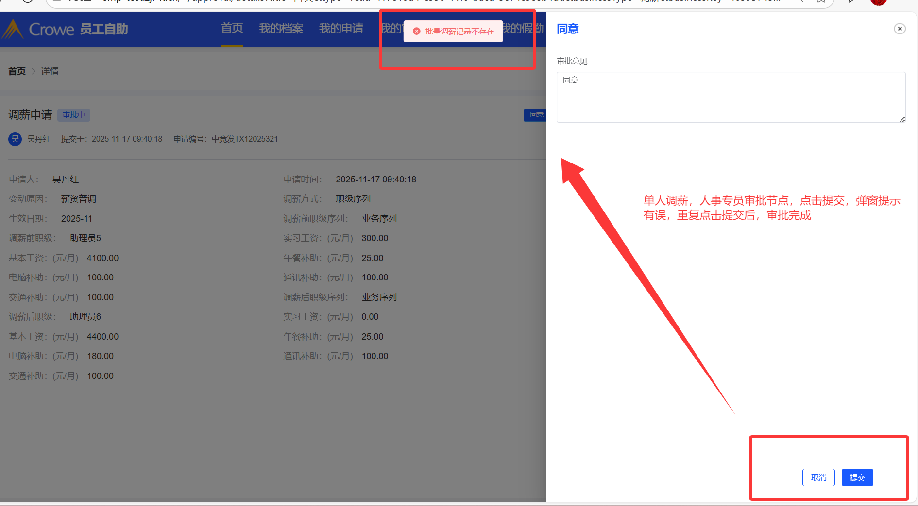 单人调薪,人事节点审批,点击提交后,弹窗提示有误,关闭后重新点击提交,提交成功