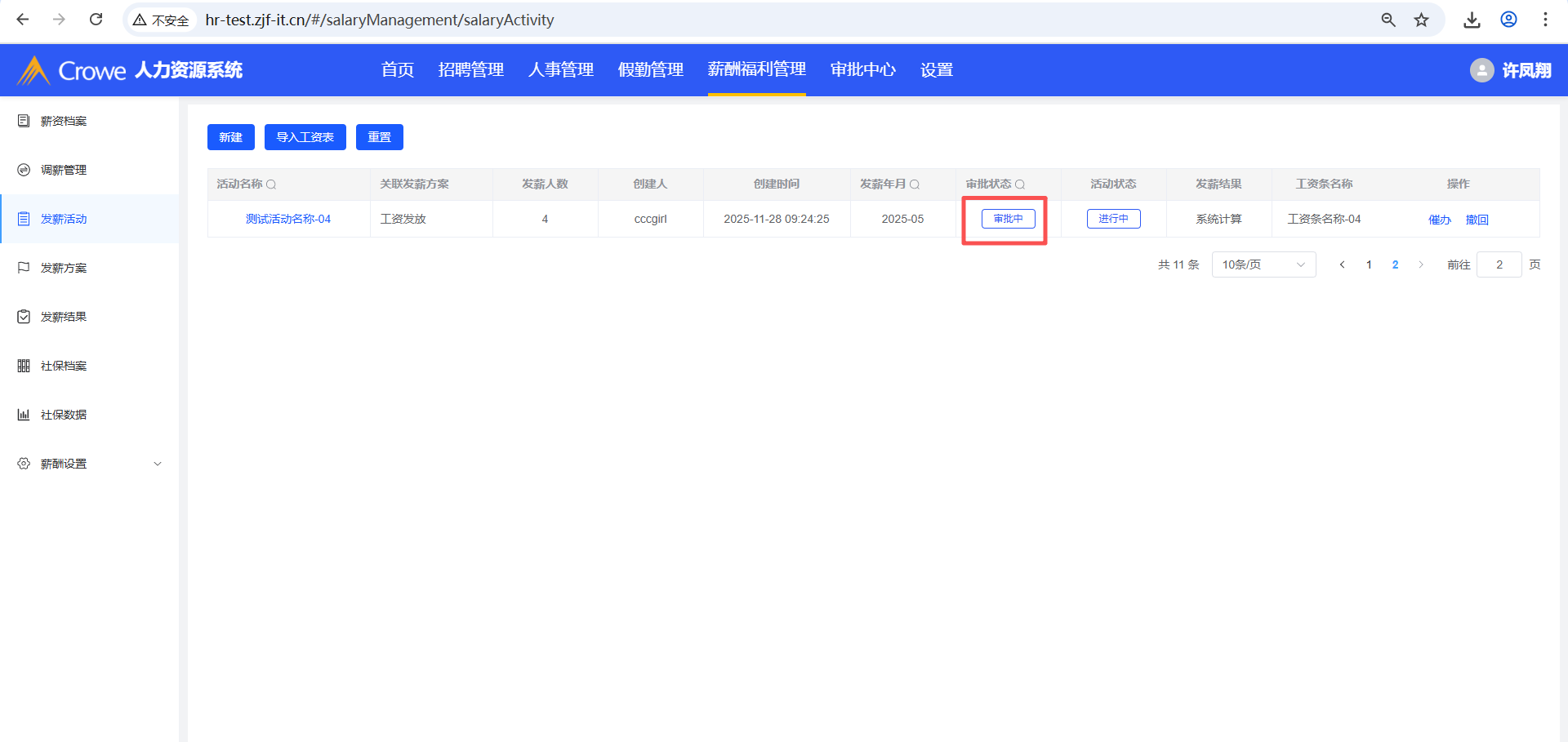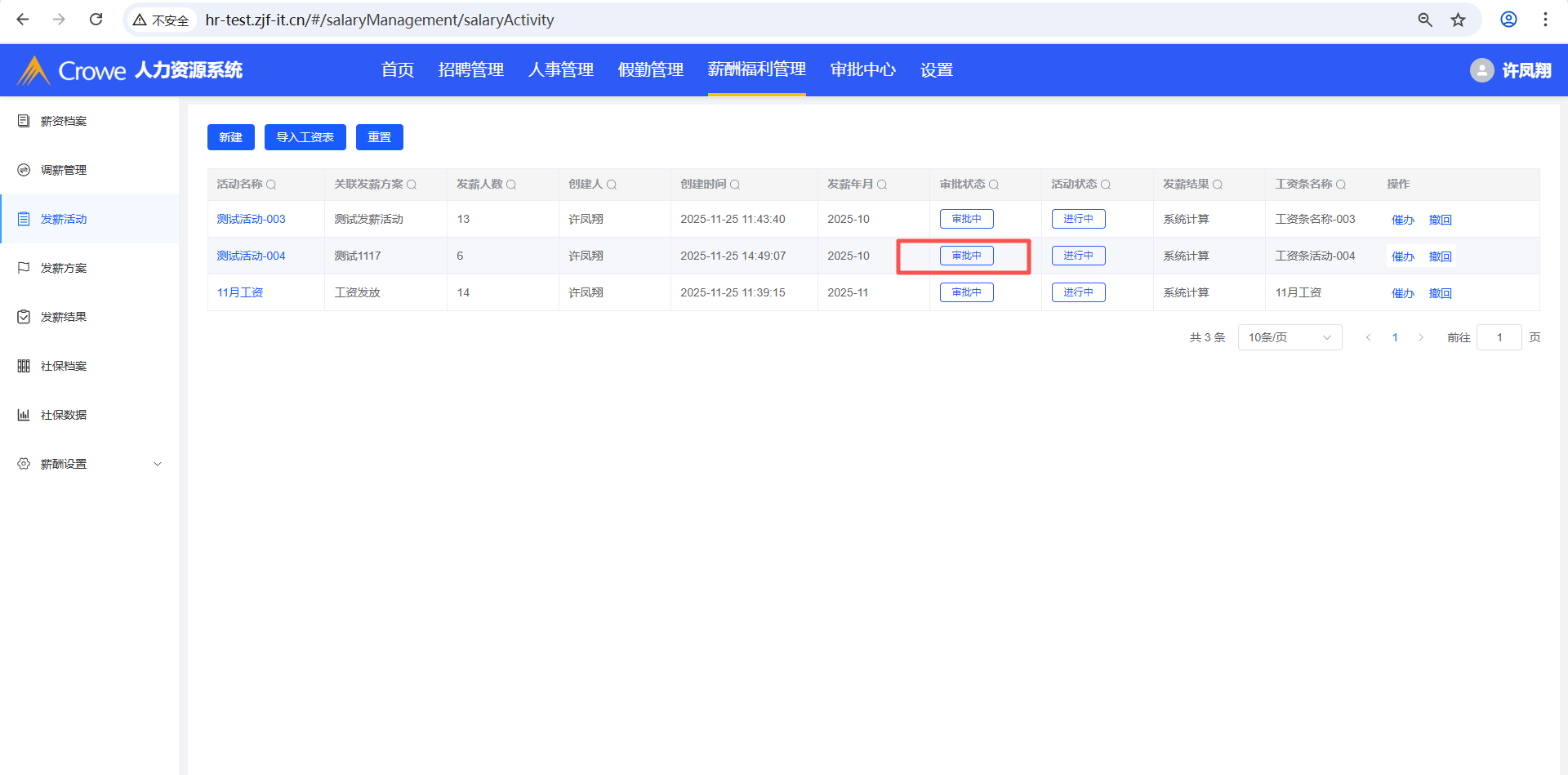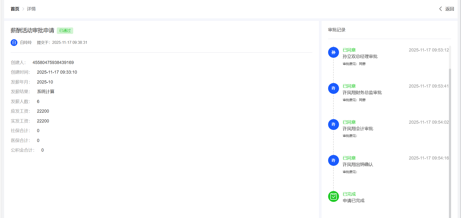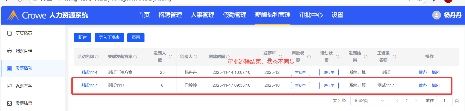 回归未通过,审批中心审批状态:已同意,发薪活动页面审批状态仍是:审批中
