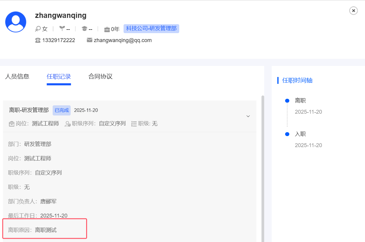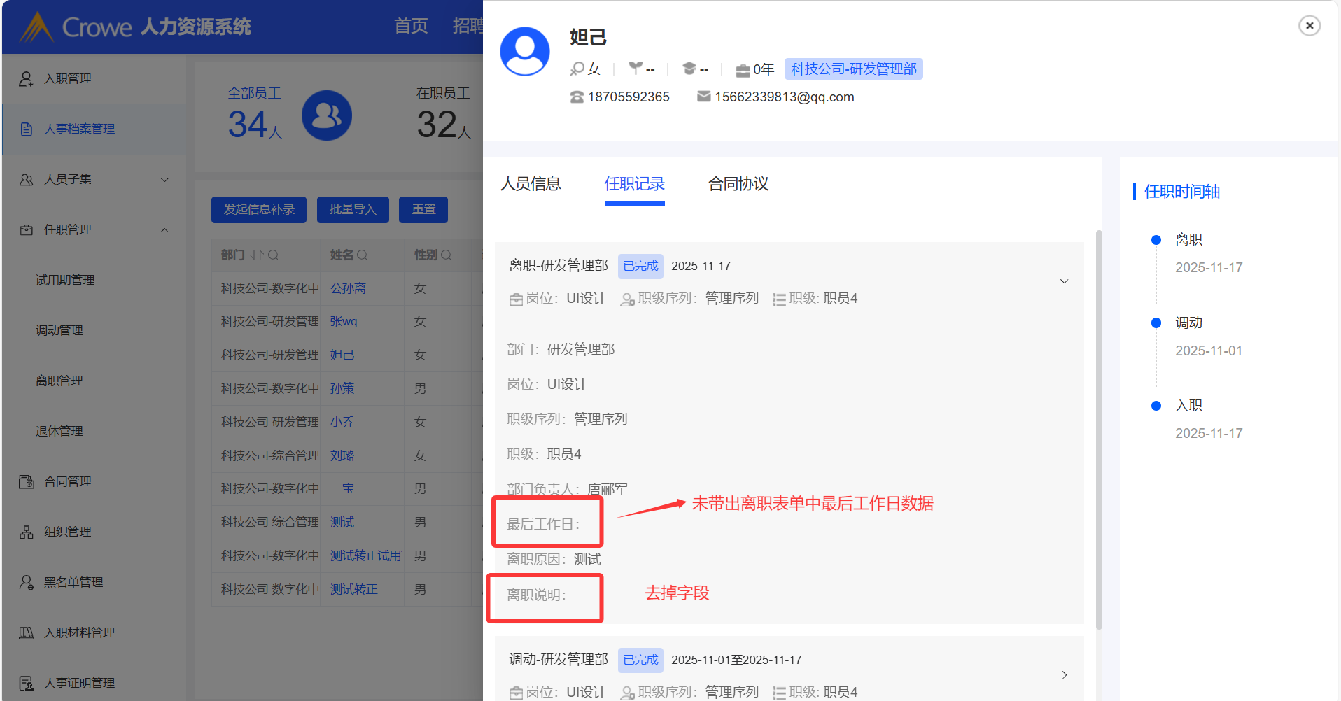 人事档案--离职员工,任职记录中,离职说明字段去掉,最后工作日数据未带出